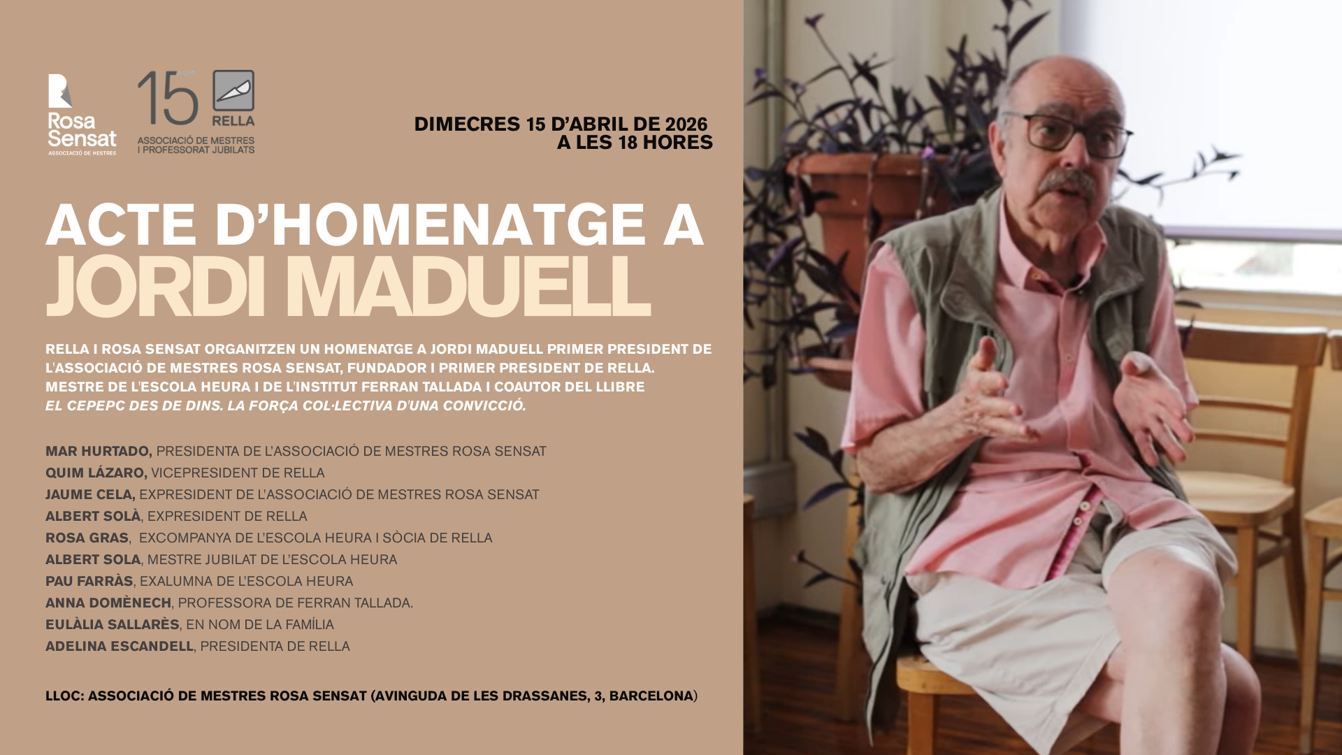 L’Associació de Mestres Rosa Sensat i RELLA organitzen un acte d’homenatge a Jordi Maduell, mestre i figura clau en la història del moviment de renovació pedagògica a Catalunya.