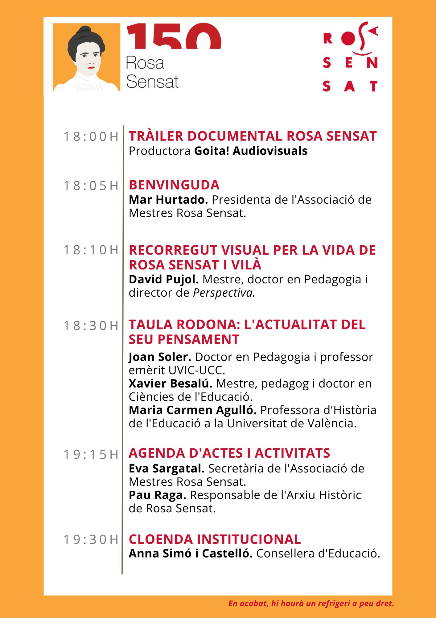L'Associació de Mestres Rosa Sensat en col·laboració amb el Departament d'Educació organitza un seguit d'actes per commemorar el 150è aniversari del naixement de Rosa Sensat i Vilà.