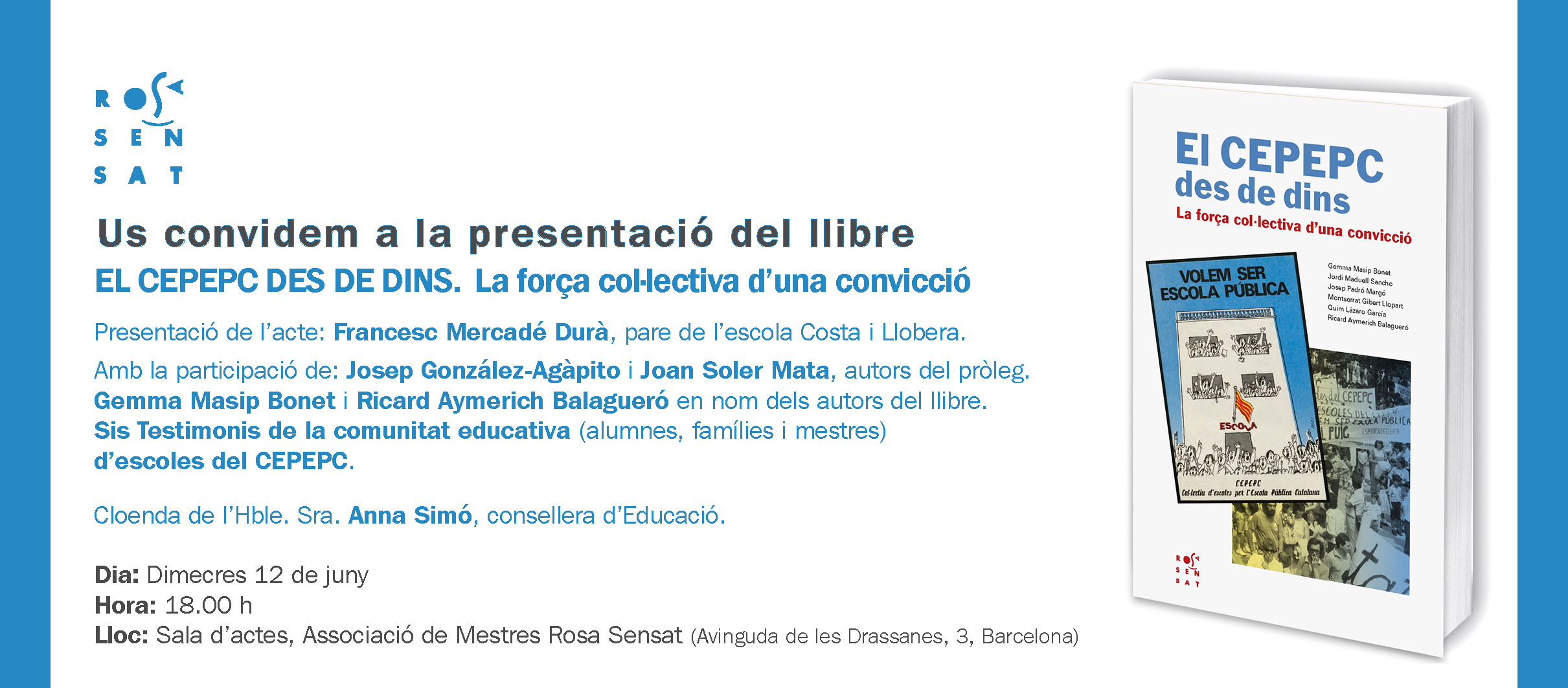 Dia i hora: Dimecres 12 de juny  a les 18:00 hores Lloc: Sala d’Actes de l’Associació de Mestres Rosa Sensat (Avinguda de les Drassanes, 3, Barcelona)
