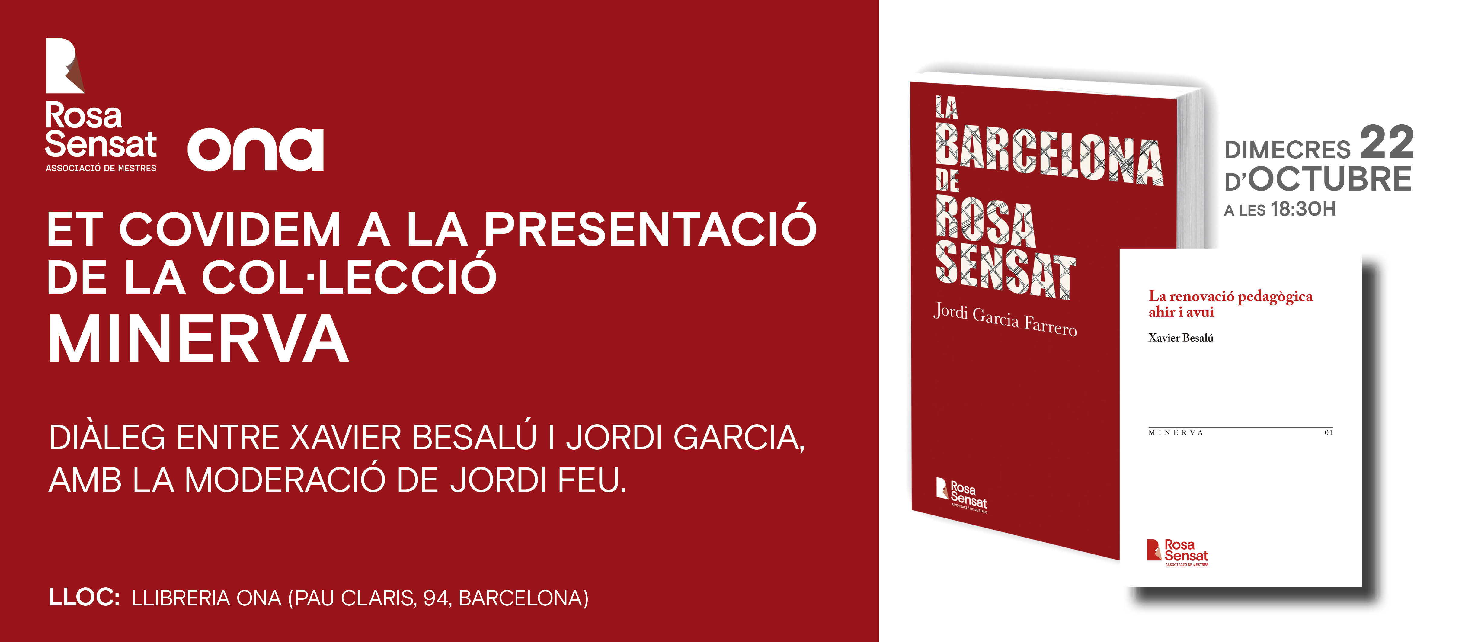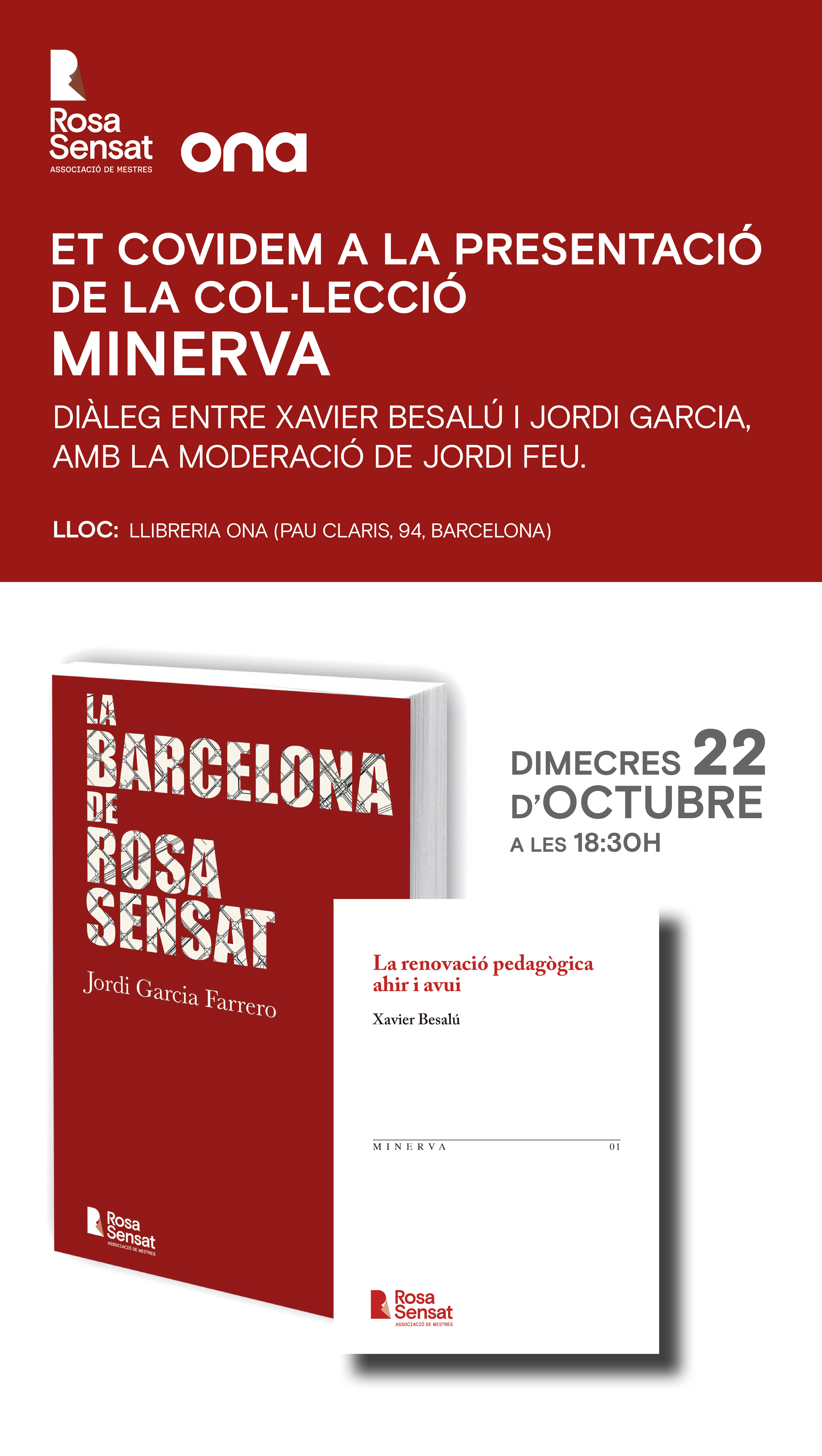 Us convidem a aquest acte amb una primera part de presentació de la nova col·lecció de llibres de l’Associació de Mestres Rosa Sensat, Minerva. Aquesta col·lecció pren el nom de la històrica Minerva, editada inicialment pel Consell de Pedagogia de la Diputació de Barcelona i, posteriorment, pel de la Mancomunitat de Catalunya. Aquella col·lecció volia oferir a un públic ampli breviaris de contingut general, «a l’abast de totes les fortunes», com deien els papers de l’època, i es dividia en dues sèries: la col·lecció popular de coneixements indispensables i la de literatures modernes. Amb aquest nom, volem retre homenatge i recuperar-ne l’esperit.