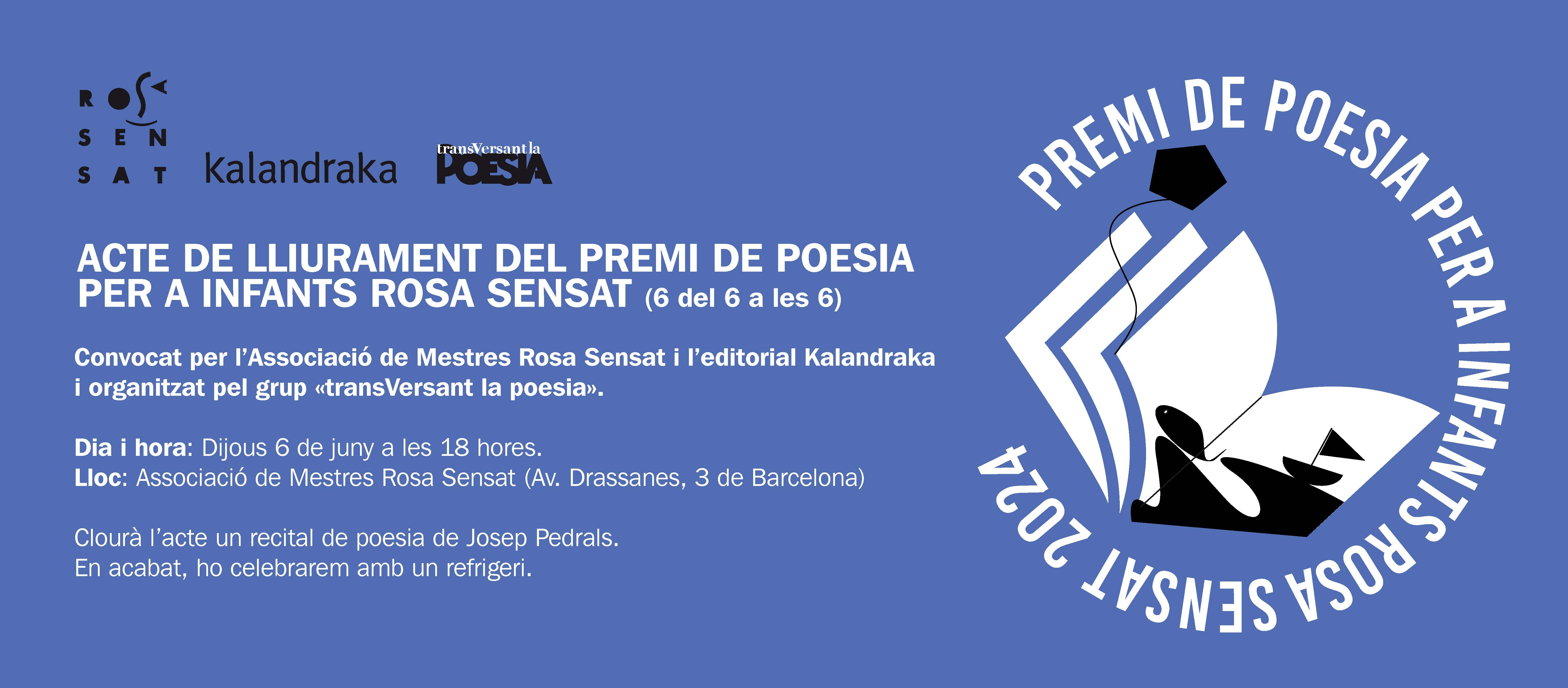 Ens plau convidar-vos a l'acte de lliurament de la primera edició del Premi de Poesia per a Infants Rosa Sensat, el qual tindrà lloc la tarda del dijous 6 de juny a la seu de l'Associació. El Premi de Poesia per a Infants Rosa Sensat, convocat per l'Associació de Mestres Rosa Sensat i l'editorial Kalandraka i organitzat pel grup transVersant la poesia, té com a objectiu estimular la creació i publicació de poesia de qualitat en llengua catalana, adreçada als infants, i promoure aquest gènere literari.
