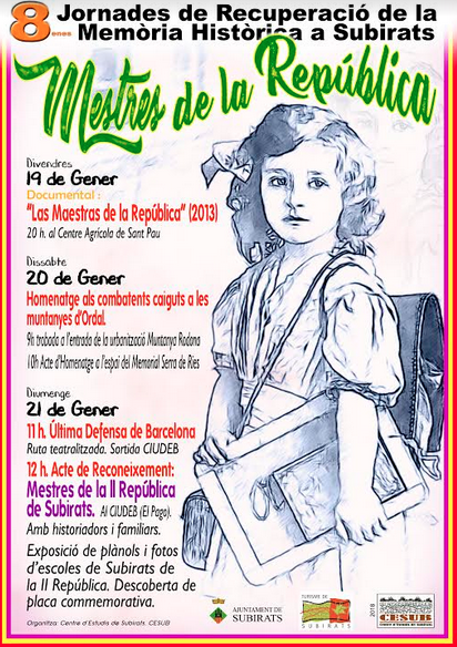 El proppassat 19 de gener van tenir lloc a Subirats unes jornades de recuperació de la Memòria Històrica; enguany centrades en recordar i homenatjar a les Mestres de la República. Va ser una manera de posar en lloc preeminent unes dones (i també homes) que van dur a terme una lluita antifeixista, antipatriarcal, implicades amb els moviments socials, de lluita contra el caciquisme.