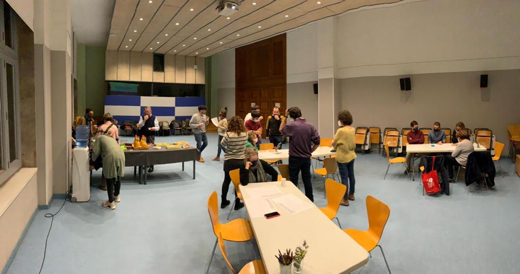Formadors i formadores van disposar d’una hora per poder passejar-se per cadascuna de les taules i prendre una decisió. La dinàmica va permetre, d’una banda, a les persones que tenien clar des del primer moment la temàtica del bloc, conversar una llarga estona sobre què fan i què volen fer i; d’altra banda, a les persones indecises, observar i participar en els diferents grups per trobar finalment el seu lloc. La pantalla de la sala projectava el nom de les persones que no van poder-hi assistir perquè es poguessin tenir en compte en la concreció de les propostes formatives.