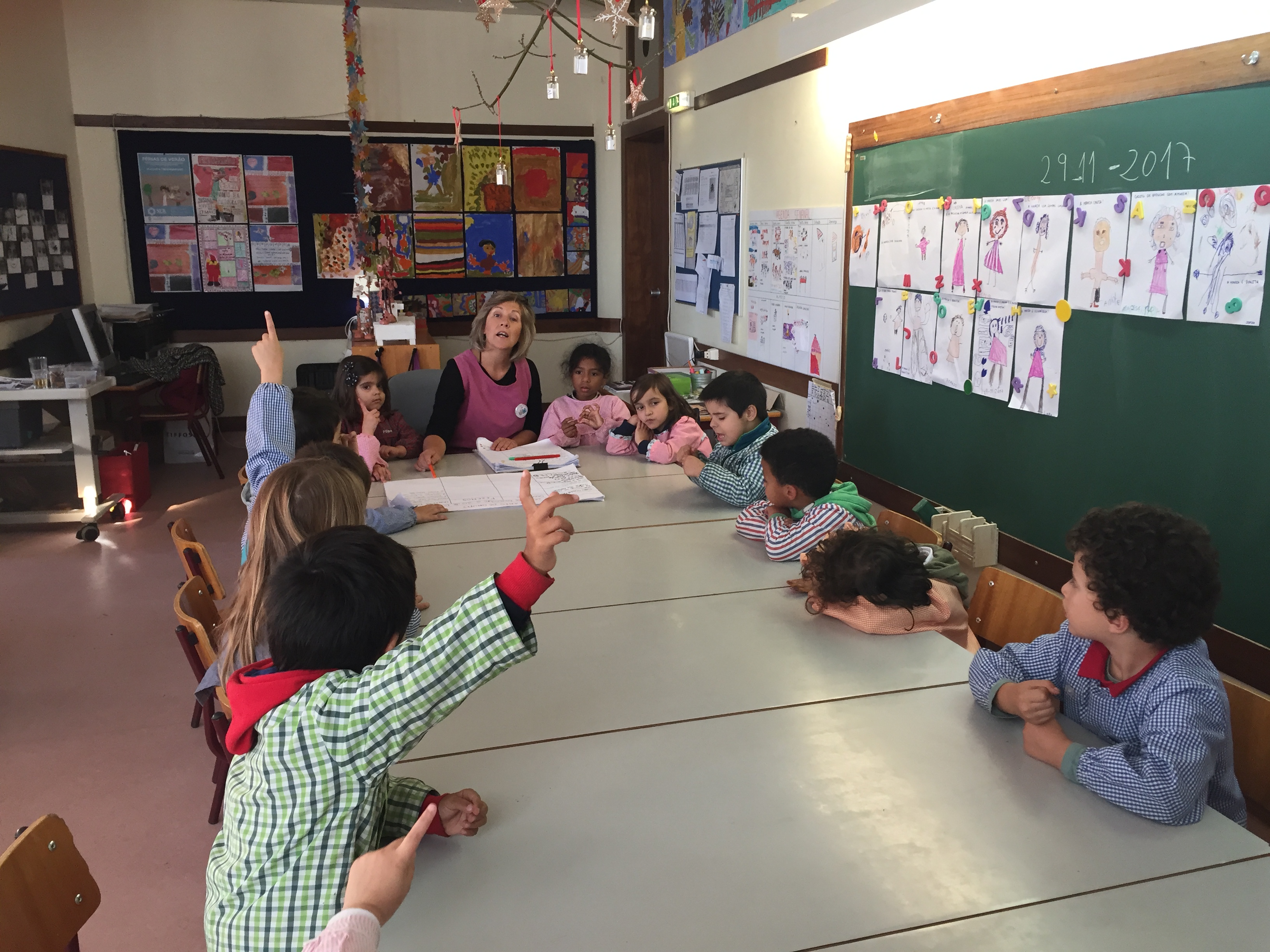 A les escoles infantils EBJIMFP el dia comença amb la rebuda dels infants en una assemblea on el grup comparteix experiències, preguntes, desitjos, maneres de ser i de fer, i la seva visió del món on viuen (figura 4). Aquestes reunions són un moment per tenir diàlegs seriosos i sensibles, oberts a diferents punts de vista. Durant les converses sorgeixen oportunitats per parlar sobre molts aspectes de la vida que impliquen prejudicis (per exemple, activitats, roba i conductes de nens i nenes, poble gitano i terroristes: bons o dolents?) i coneixements del món (per exemple, països, pràctiques culturals, vida al camp, necessitats dels animalons, cementiris i mort, terrorisme, incendis...).