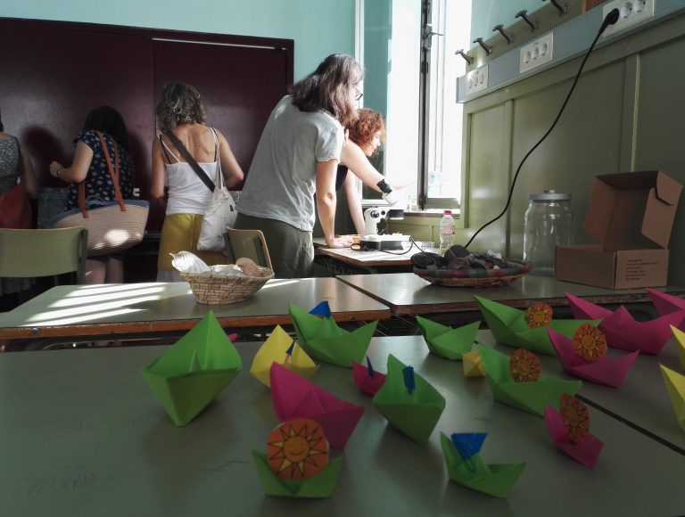 La distribució dels elements en l’espai és gairebé una anomalia, i sembla que no es regeix per una lògica concreta. Les taules no miren endavant, no imposen uns rols preestablerts, ni tan sols ocupen un lloc central a l’aula. Hi ha tot tipus d’objectes, passant per alguns de convencionals –contes o vaixells de paper–, d’altres que coneixem, però que no acostumen a ser en una classe –ampolles d’aigua, sorres–, fins a arribar als motius geomètrics i el material reciclat, que són els que més interès generen en els adults.