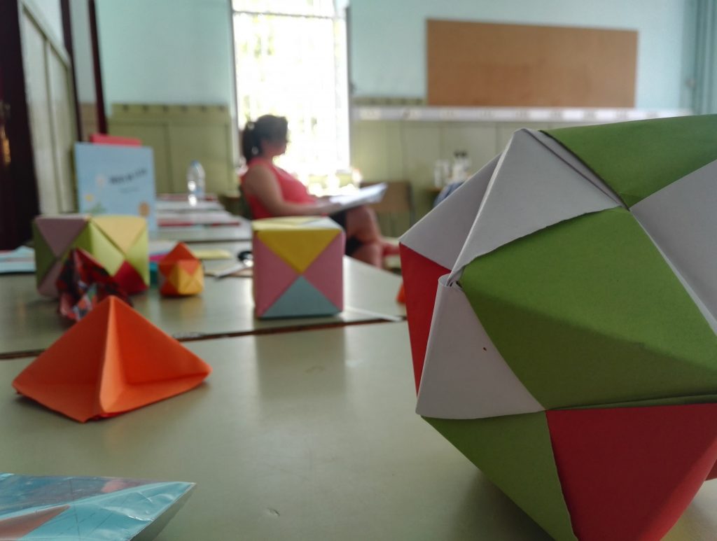 Eloi Arisa atén l’Ana, que pregunta, encuriosida, davant d’un conjunt de trapezis de goma: «Per a què serveix que els nens facin mosaics?» Les mans del formador juguen amb el material, i acaben formant una figura tridimensional, amb volum. Una cosa que no es pot fer sobre un full en blanc. A uns metres de distància, en una altra aula, la seva mare ensenya a un altre grup com es poden fer quadrats i multiplicacions amb figures geomètriques de fusta: «Per què hauríem d’explicar la propietat commutativa com una cosa abstracta si la podem comprovar físicament?»
