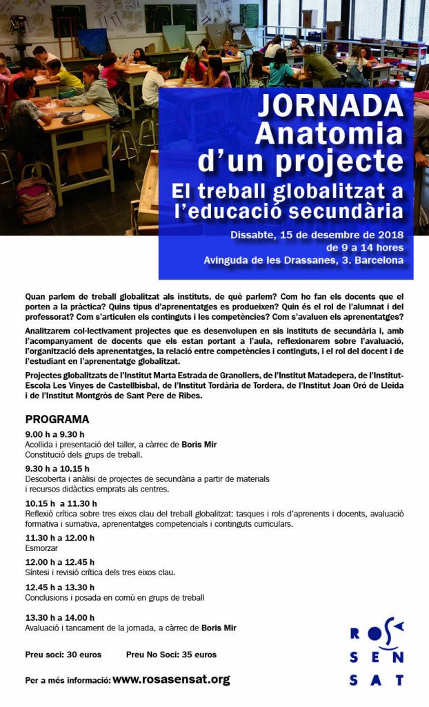 A punt per al tancament de trimestre? Fes un respir amb Rosa Sensat  i vine a la jornada «Anatomia d'un projecte», coordinada per Boris Mir, on compartirem i coneixerem experiències i aprenentatges al voltant del treball globalitzat als instituts! Quan parlem de treball globalitzat als instituts, de què parlem? Com ho fan els docents que el porten a la pràctica? Quins tipus d'aprenentatges es produeixen? Quin és el rol de l'alumnat i del professorat? Com s'articulen els continguts i les competències? Com s'avaluen els aprenentatges? En aquesta jornada analitzarem col·lectivament projectes que es desenvolupen en sis instituts de secundària i, amb l'acompanyament dels docents que els estan portant a l'aula, reflexionarem sobre l'avaluació, l'organització dels aprenentatges, la relació entre competències i continguts, i el rol del docent i de l'estudiant en l'aprenentatge globalitzat. A més, coneixerem de primera mà els projectes globalitzats de l'Institut Marta Estrada de Granollers, de l'Institut de Matadepera, de l'Institut Escola Les Vinyes de Castellbisbal, de l'Institut Tordària de Tordera, de l'Institut Joan Oró de Lleida i de l'Institut Montgròs de Sant Pere de Ribes. La jornada es durà a terme a la seu de l'Associació de Mestres Rosa Sensat (avinguda de les Drassanes, 3, Barcelona) el proper dissabte 15 de desembre de 9 a 14 h. El preu de la inscripció és de 30 € per a les persones sòcies de Rosa Sensat i de 35 € per a la resta. Inscriu-t'hi aquí!