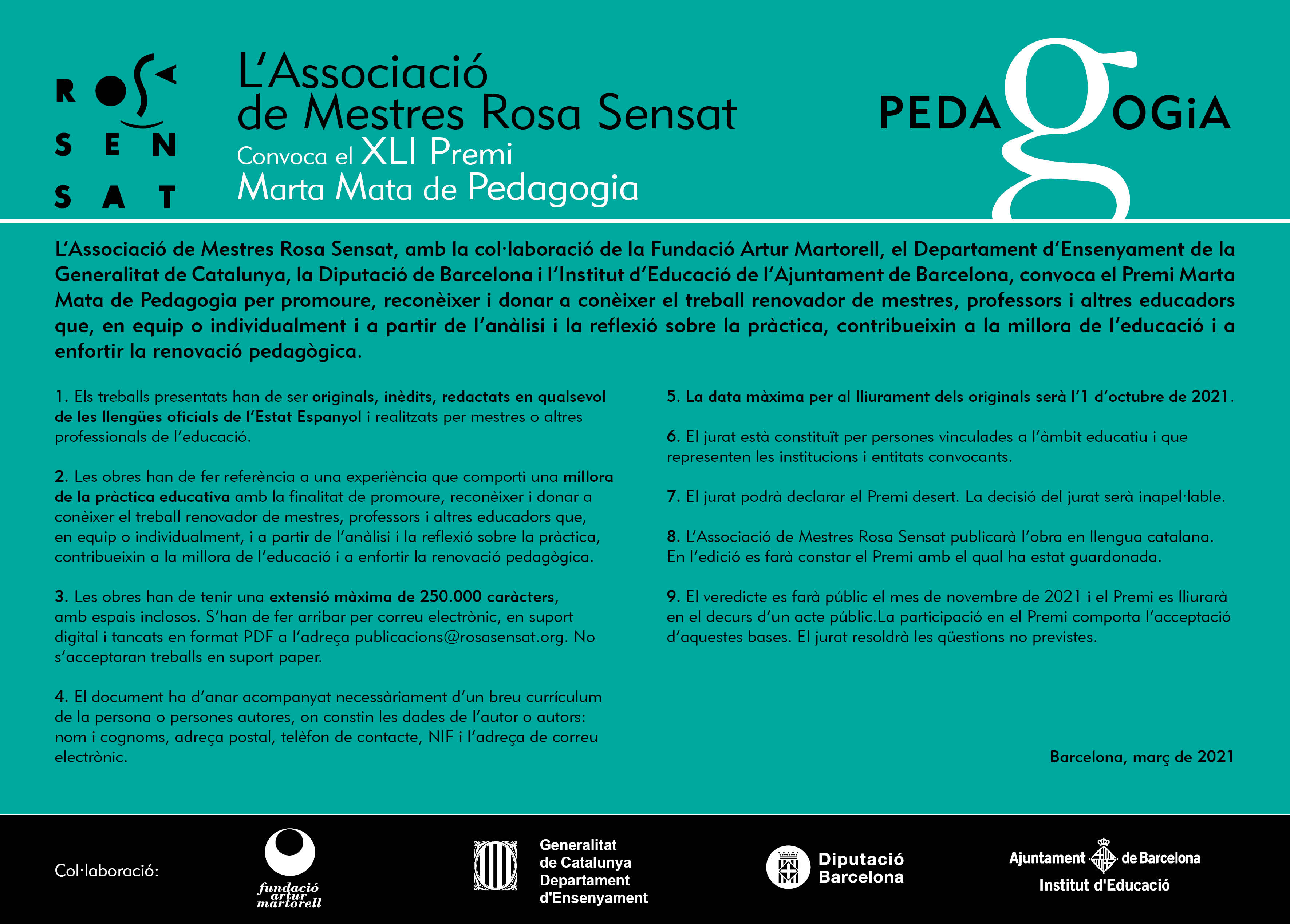 L’Associació de Mestres Rosa Sensat, amb la col·laboració de la Fundació Artur Martorell, el Departament d’Ensenyament de la Generalitat de Catalunya, la Diputació de Barcelona i l’Institut d’Educació de l’Ajuntament de Barcelona, convoca el Premi Marta Mata de Pedagogia per promoure, reconèixer i donar a conèixer el treball renovador de mestres, professors i altres educadors que, en equip o individualment i a partir de l’anàlisi i la reflexió sobre la pràctica, contribueixin a la millora de l’educació i a enfortir la renovació pedagògica.