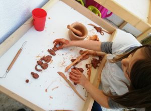 Modelatge: s’ofereixen diferents materials (mà de morter i morter, corrons, argila, farina i sal) per crear, modelar, potenciar la força de la mà i experimentar. La nostra intenció era crear propostes obertes que també permetessin anar més enllà. Per exemple a l’hora de fer pasta de sal, calen unes mesures concretes per poder-la modelar, si no es respecten s’ha de pensar què cal fer. Aquí sorgeix de manera espontània, la pràctica del mètode científic.