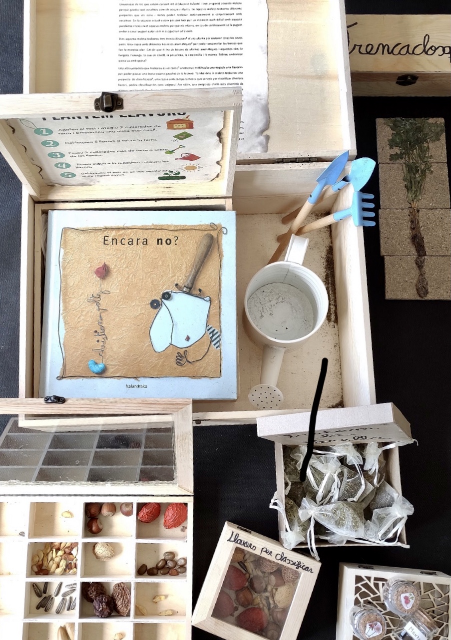 Simultàniament, des de l’escola i des de la Universitat, es van anar preparant les caixes en presentacions variades segons la temàtica (cistells, cabassos, motxilles, maletes…)Simultàniament, des de l’escola i des de la Universitat, es van anar preparant les caixes en presentacions variades segons la temàtica (cistells, cabassos, motxilles, maletes…). A dins hi ha diferents materials que permeten fer activitats de joc i treball a casa, acompanyats d’instruccions intuïtives. Algunes es poden fer de manera autònoma i d’altres requereixen la intervenció de la família. N’hem preparat una vintena de temàtiques diverses. Un cop han acabat les propostes, les famílies poden enviar fotografies i impressions a la responsable de la caixa, i els infants poden plasmar-ho en una llibreta. A la web de l’escola poden consultar les diferents documentacions. Us en posem alguns exemples: Llavors i plantes: consisteix en posar a l’abast dels infants diferents tipus de sòl, llavors i estris d’horticultura. Hi ha algunes propostes per investigar i descobrir-ne les seves característiques principals. Van acompanyades del llibre Encara no? de Christian Voltz.
