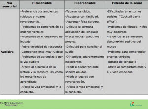 On tot comença Les funcions bàsiques més estudiades del processament auditiu central tenen a veure amb la connexió sensorial auditiva amb l’entorn, la localització de la font de so, el control i l’ajust del volum d’entrada de la informació, el filtrat del senyal, és a dir la capacitat de fer l’anàlisi figura-fons auditiu i la instauració del codi fonològic del llenguatge. Durant la infància totes aquestes eines bàsiques de processament auditiu han d’anar desenvolupant-se, per la qual cosa qualsevol problema com les otitis, les infeccions de vies altes, la privació d’estimulació del llenguatge, etcètera, poden tenir conseqüències a mitjà i llarg termini en el desenvolupament quan aquests problemes tenen lloc durant els períodes crítics de maduració sinàptica i mielinització de la ruta auditiva i les seves radiacions cap a les àrees del llenguatge i el lòbul frontal. En la taula que ve a continuació, podem veure símptomes típics de nens que presen-ten dificultats en el processament auditiu de la informació, tant si són hiposensibles com si són hipersensibles o si presenten problemes amb el filtratge del senyal, és a dir, amb la capacitat que té el cervell de discriminar figura/fons auditius o, en paraules més senzilles, de separar el que importa del que no importa en l’audició.