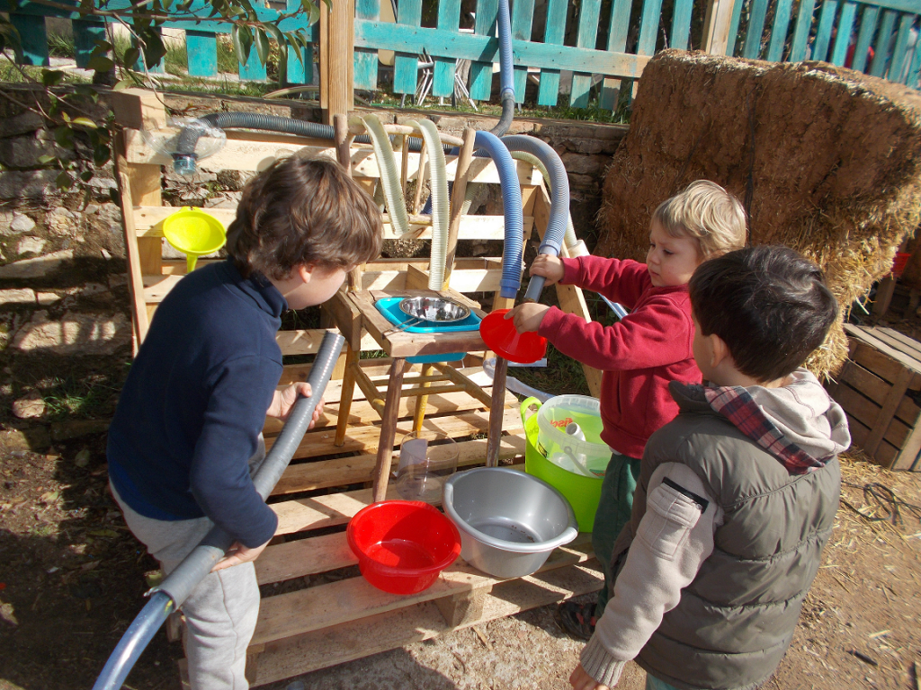 Posar a l’abast dels nens aquestes matèries en racons a l’interior o en tallers és una possibilitat, però nosaltres pensem que com més respectem el lloc en què realment són aquests elements i la presència combinada d’aquests elements —tal com es dona en la natura—, més polifacètica serà l’experiència en comparació amb marcs preparats d’experiència, fonamentalment, només sensorial. És més potent —per més creativa i més intencional— l’experiència amb la terra en un jardí o sorral —amb aigua a prop, amb estris per manipular-la, amb recipients, amb elements vegetals i minerals naturals a l’abast...— que en uns gibrells acotats en un interior amb coladors, embuts o objectes —tot i que a nivell sensorial pot tenir, certament, el seu sentit.