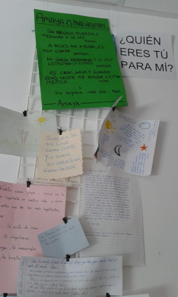 En la Escuela Infantil de Manzanares el Real, Madrid, estamos intentando ofrecer ambientes y propuestas que se basen en «establecer el cuidado mutuo como eje de las relaciones humanas» (Rogero Anaya, J. y Rogero, J., 2013). La identidad no es simplemente algo que se tiene sino que, a partir de la interacción social, es un proceso que negociamos con los demás… M. Rodrigo Alsina (2009) Llevamos unos años formándonos, reflexionando y replanteándonos temas tan fundamentales como el proceso de construcción de la identidad, el desarrollo socio-afectivo, la interacción entre iguales, el bienestar de los niños, las familias y los docentes, la colaboración familia-escuela… Es destacable en los últimos años la profusión de publicaciones sobre estos temas. ¿Será que «vivimos en una sociedad descuidada que no presta atención al otro y a los otros, sobre todo a los más débiles, que ha renunciado a construir el "nosotros"» (Rogero, 2010, pág. 59)? Durante el curso 2017-2018, nos planteamos como línea común de trabajo con la comu­nidad educativa la identidad, las emociones y los sentimientos. A partir de la primera puesta en común sobre el tema, realizada por el equipo educativo para coordinar diversas actuaciones, la tutora del grupo de 2-3 años inició un proceso, compartido con las familias. Como tutora del grupo de 2-3 años comencé a pensar qué propuestas podía ofrecer a los niños y a las niñas y a sus familias en cada uno de los trimestres. Tenía algunas ideas y, con la ayuda de la orientadora del eat, decidimos ir dando forma a todo ello. Mercedes, 2017 La metáfora de la identidad como patchwork que propone Rodrigo Alsina (2009) ha sido inspiradora para nosotras. Como apunta este autor, «cuando un fenómeno es tan complejo que se nos escapa, la forma de entenderlo y comunicarlo es buscar una metáfora que lo haga comprensible» (pág. 287). Así mismo nos recuerda que la identidad está en construcción permanente y que cuanto mayores sean las posibilidades del individuo para «crear» su propia identidad, más rica y compleja será esta (pág. 296). En este sentido hemos tomado en consideración los siguientes aspectos: • La identidad se construye discursivamente. • Es un proceso artesanal, complejo, personal y único. • La socialización y la cultura son fundamentales en dicho proceso, ya que la identidad se constituye de fragmentos de variadas y diversas experiencias vitales. • En la construcción de la identidad hay una continuidad en la heterogeneidad. Por tanto, la construcción de la identidad se realiza creativamente y se va transformando durante toda nuestra vida. «Es un recoser permanente, pero todos los añadidos están entretejidos, aunque con mayor o menor consistencia» (Rodrigo Alsina, 2009, pág. 297). La pregunta que ha guiado este recorrido, «¿Quién eres tú para mí?» se ha ido concretando a lo largo del curso y nos ha permitido tejer lentamente, junto con los niños y sus familias, algunos retazos del patchwork único y original de cada uno. Sería muy extenso reflejar aquí todas las experiencias vividas, por lo que nos centraremos en dos que han sido muy potentes afectivamente para los niños y las niñas, para sus respectivas familias y para la educadora: el retrato de cada uno y la poética quién eres tú para mí. En la reunión del primer trimestre se informó a las familias sobre el proyecto que pretendíamos realizar con el grupo de 2-3 años. El objetivo fundamental es que niños y niñas vivieran una experiencia afectiva rica y amorosa. Sabemos que las personas encontramos bienestar cuando somos reconocidas, valoradas, rescatadas del anonimato. Esta era la idea fundamental que transmitimos a las familias y, desde luego, las primeras sorprendidas y emocionadas hemos sido las profesionales, puesto que los padres, madres, hermanos, abuelos…, se han implicado con gran interés. En nuestra escuela siempre es importante la participación de las familias, tanto en momentos puntuales, como puede ser acudir a contar un cuento o a tocar un instrumento, o de modo permanente colaborando en la ambientación, recopilando materiales o en actividades individuales junto a sus hijos. Las puertas están abiertas de par en par para cada familia. En este curso volvimos a ofrecerles la oportunidad de hacerlo y respondieron con creces a nuestras expectativas. Mercedes, 2017 Al comenzar el segundo trimestre enviamos una carta a cada familia recordando que iniciaríamos la propuesta haciendo un retrato de su hijo, en el que de alguna manera participará el propio niño. No se dieron pautas para la realización de los mismos. Únicamente, para facilitar la tarea, la tutora entregó una cartulina del tamaño apropiado para poder enmarcarlo, con la foto y el nombre de cada uno en una esquina. Se solicitó también que, acompañando al retrato, aportaran tarjetas o un pequeño cuaderno con fotos, o audio, o vídeo recogiendo lo que el niño expresaba durante el proceso, así como que escribieran características y gustos personales de su hijo: ¿Qué le hace feliz? ¿Qué le hace enfadarse? ¿Cuál es su juguete preferido? ¿Qué objeto es fundamental para él o ella?… Los retratos, los documentos gráficos y los objetos fueron llegando y con ellos se fue narrando, con la ayuda de las voces de cada mamá o papá, que vinieron a clase, un trocito de la historia peculiar y original de cada uno. La atención con la que los niños y las niñas escuchaban fue realmente impactante. En este sentido Anglada y Arnaiz (2018) nos plantean que los seres humanos «somos protagonistas de nuestras vidas en la medida en que nos relatamos» (pág. 10). Nos recuerdan que el niño que «encuentra ayuda para aprender a evocar o para anunciar, aprende a persistir conscientemente en el tiempo, aprende a entenderse» (pág. 10). Estos objetos cotidianos e importantes para cada uno se fueron colocando en un lugar accesible para que todos pudieran recurrir a ello