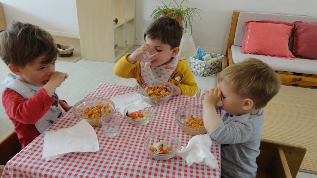 Poco a poco, cuando hay en el grupo más niños y niñas que se encuentran en el mismo momento evolutivo, se empieza a compartir el espacio de la comida. Será lentamente que la comida pasará a ser un instante de relaciones, de encuentro con los compañeros y las compañeras, una oportunidad para socializar y compartir. Primero, una comida compartida en pareja. Dos niños que se encuentren en un momento parecido. Y progresivamente ir aumentando este grupo y compartir este momento con algunos compañeros y compañeras más, sin perder la intimidad que el pequeño grupo ofrece. Este paso, como los otros, hay que vivirlo con alegría, y el adulto debe estar cerca para garantizar que todos los niños y todas las niñas viven este momento de forma distendida y relajada.