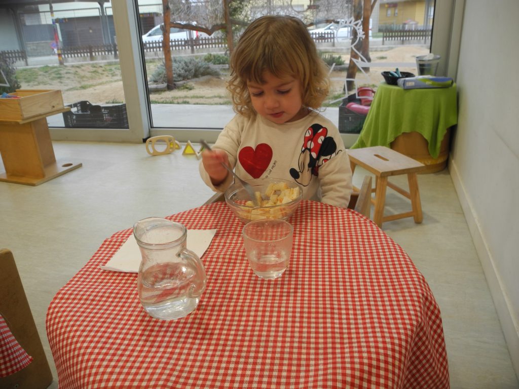 Habitualmente es cuando el niño muestra interés por el compañero en diferentes momentos de juego. Las relaciones sociales son cada vez más buscadas y ya no son fruto de la espontaneidad. No olvidemos que el rato de la comida es un momento de relaciones sociales importantes, sin pasar por alto que el niño tiene que mostrar la necesidad y el interés de vivir esta experiencia. Sentarse en la silla y no en el regazo de la educadora no quiere decir abandonarlo a su suerte. No, en ningún caso. Seguimos acompañando a la criatura desde su lado, sin interferir, pero cerca, por si necesita nuestra ayuda en algún momento. Este primer paso de sentarse a una mesa y silla baja se desarrolla igualmente de forma individual. Como todo, es un proceso, y hay que ofrecer el tiempo que cada cual necesita para habituarse al cambio.