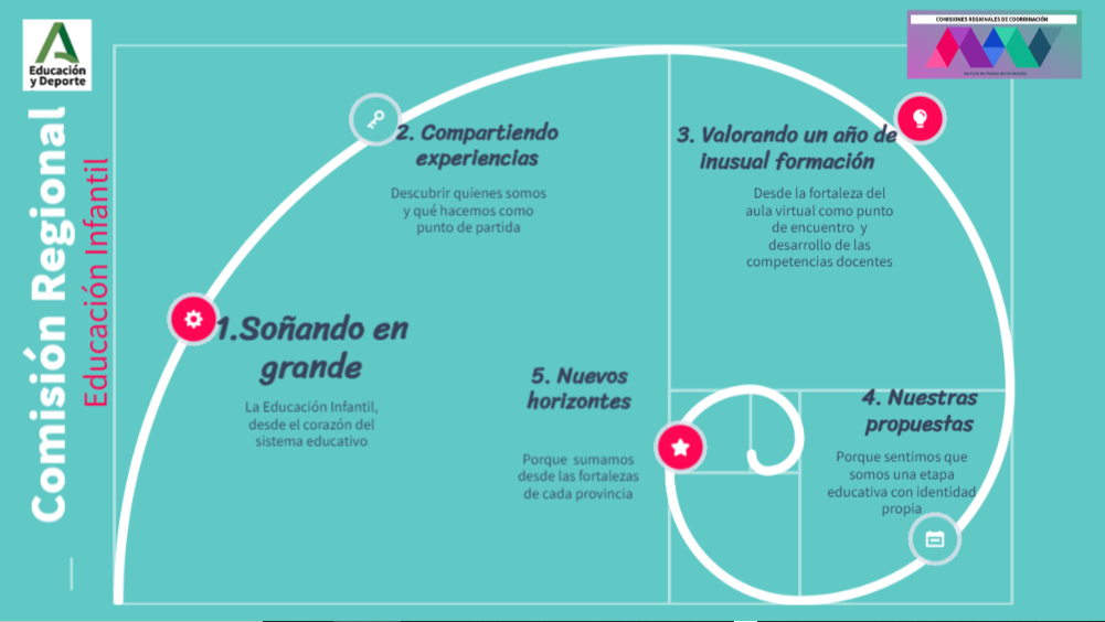 Para dar respuesta a estos retos, durante el curso 2020-2021 se creó por primera vez en Andalucía la Comisión Regional de Educación Infantil, formada por una representación de las asesorías de formación de Educación Infantil de cada provincia, para repensar la oferta formativa de Andalucía dirigida a esta etapa educativa y analizar las posibilidades y dificultades que suponía la incorporación de los centros de Educación Infantil 0-3 a la red de formación desde una mirada centrada en tres aspectos interrelacionados: