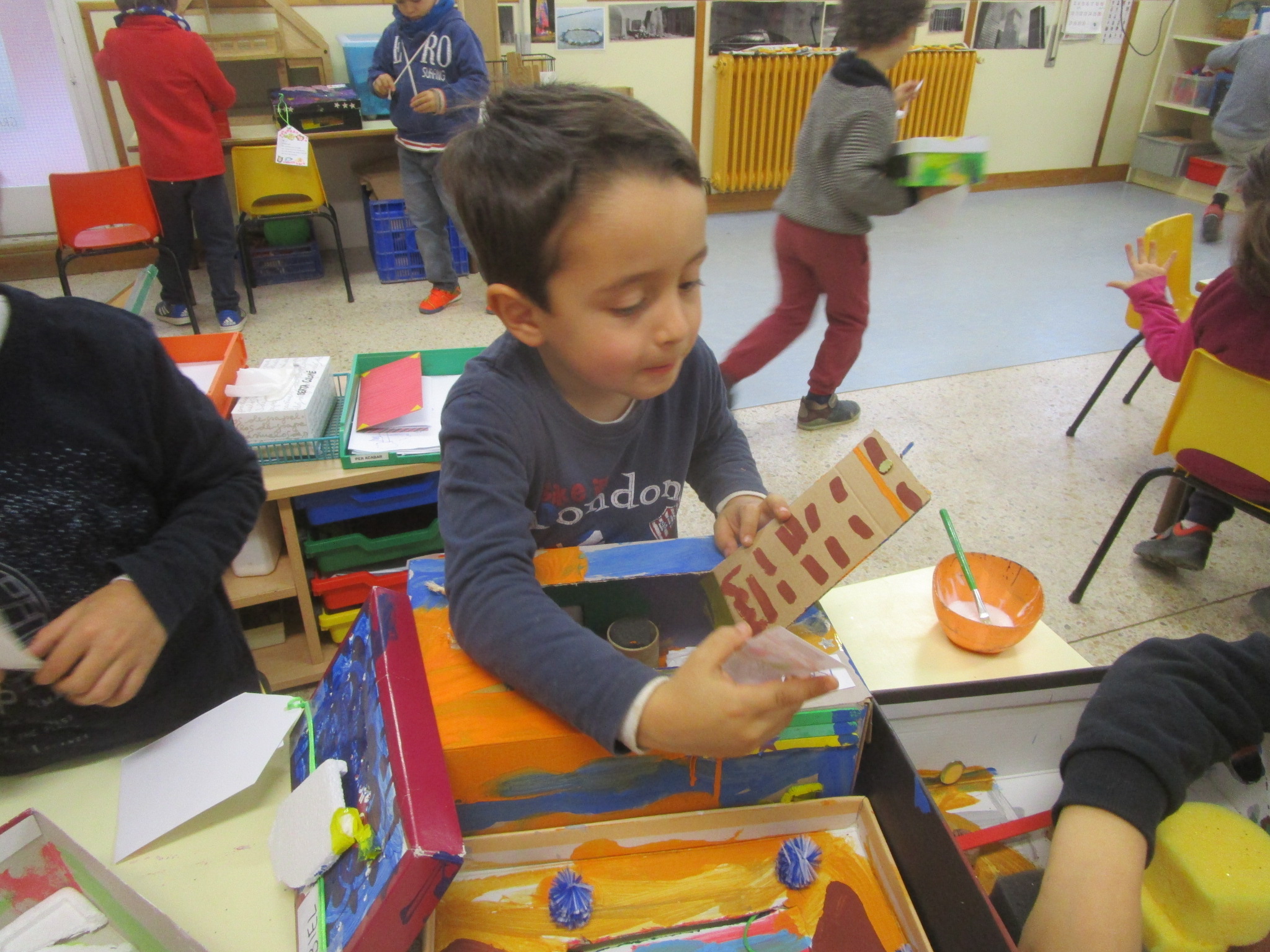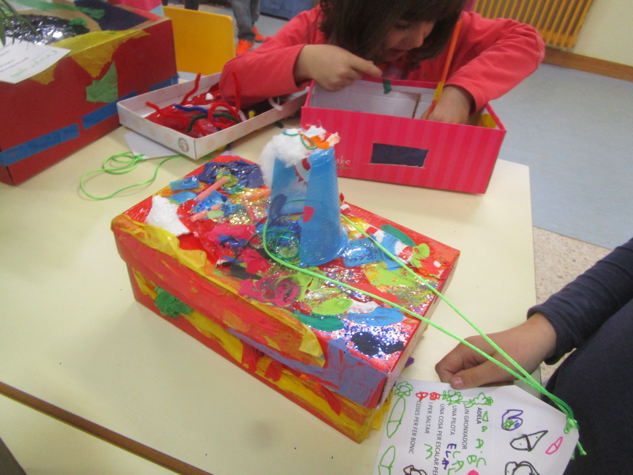 Tot va començar amb l’afició d’atrapar cucs bola –porquets de Sant Antoni– al pati, afició que es repeteix cada curs, any rere any. No sé com és que encara queden cucs bola! Al mateix temps vam descobrir un cuc dins una castanya que havia portat l’Elna. Vaig comentar als nens i les nenes de cinc anys que, si volien tenir durant un temps els cucs bola a la classe i el cuc de la castanya, els havíem de muntar un habitacle que cobrís les seves necessitats. Ho vam estar parlant i tenien molt clar que els cucs bola necessitaven aire, aigua, menjar i humitat. I el cuc de la castanya, castanyes. Però l’Adriano va dir: –Sí. Però ha de ser tan avorrit, tot el dia foradant i menjant! Si té una mica de terra pot jugar. –I un tobogan. –I li podem fer ninos tovets –Elna. Així va ser com uns quants van començar a crear espais de joc per als cucs bola. Vam agafar capses del paper de la fotocopiadora i per grupets les transformaven en espais plens de sorpreses i bones idees. Ho feien gairebé totalment sols, buscant solucions per foradar, enganxar... Els vaig proporcionar tot el material que se’m va acudir: trossos de cartró i de cartolina, escurapipes, trossets de roba, plàstic de bombolles, cordills, esponges... Quan van intentar posar els cucs bola a les capses perquè juguessin i treure’ls del terrari que els havíem construït, vaig fer ràpidament una nova proposta per salvar els cucs i també per continuar una activitat que els entusiasmava. Els vaig dir que podien portar tots una capsa de sabates i que imaginarien un espai de joc per a ells mateixos, tal com alguns havien fet per als cucs. Però que potser els cucs després de jugar una mica estarien millor al terrari. I així ho vam fer. Però hi havia un problema ben gran: –No hi cabrem. No hi podrem jugar. Era difícil la idea de proporció i escala. Els vaig dir que ells també serien petits, que podrien jugar amb un clic. Després se’ns va acudir que es podien dibuixar ells mateixos per poder entrar i jugar dins el món màgic de la capsa. Perquè fos més real que eren ells, els vaig donar a tots la seva cara fotografiada impresa perquè acabessin de fer-hi el cos. Cadascú va començar a somiar què hi voldria a la seva capsa. La Mar volia veure els peixets de la peixera i fer nanses a la capsa per poder portar-la amunt i avall. La Lúa hi volia rajoles de colors, un llit per estirar-se i mirar les estrelles i una molla per saltar. L’Orianna volia finestres rodones per mirar el cel. La Candela volia una capsa-castell i el terra de bombolles per fer-les explotar quan hi saltés al damunt. La Carla, un tobogan i un cau. El Walid, una claraboia per veure la nit i un mirall. L’Elna volia lianes al sostre i un pal per enfilar-se… Molts elements estaven relacionats amb el moviment: laberints, gronxadors, escales, túnels, llits elàstics, jocs d’equilibris, ponts, piscines de boles, coses per escalar, cistelles de bàsquet. Van anar treballant en grups petits per fer la seva capsa, muntar-la, pintar-la... van fer molta feina. El més difícil era com es podia fer tot allò que havien pensat amb el material que tenien a l’abast. S’ajudaven uns als altres i es donaven idees. Ho anàvem fent en diferents moments del dia.           Era interessant perquè, malgrat que s’intercanviaven moltes idees, cada capsa era diferent, cada una tenia les seves particularitats: cortines de pluja, sostres de núvols, escales toves, cortines, llits, sofàs, finestres i portes de tota mena. Al final vam pensar que, abans d’emportar-s’ho cap a casa per jugar, podíem fer una petita exposició per a les famílies de la classe, ja que era el primer petit projecte que fèiem aquest curs. Ells mateixos van decorar i posar etiquetes, van arreglar tot allò que queia, van col·locar el personatge (ells dibuixats a proporció) a la seva capsa. Les famílies van veure l’exposició un divendres en recollir els fills. El dilluns alguns tornaven dient que havien jugat amb les capses a casa amb clics i ninos petits. Aprofitant el que deien, i com que fins a aquell moment em costava tenir converses que impliquessin tothom, vaig intentar parlar del que havien fet, què els havia semblat, si havia estat difícil... –He fet coses noves que no havia fet mai –Mar. –Pensàvem les coses però no sabíem com fer-les. Amb l’ajuda de l’Agnès ho he aconseguit fer –Adela. –Ara tenim una joguina nova per jugar a casa. –Fer-la ens ha fet pensar –Àfrica. –Jo no sabia fer llits elàstics ni equilibris de joc i ara ja sí –Violeta. –Tu ens vas ajudar. –I la Lurdes també. La Lurdes, la mestra d’educació física de l’escola, que comparteix força estones amb nosaltres, va tenir una bona idea i ens va proposar muntar al gimnàs un espai de joc amb algunes de les propostes que havien construït a les seves capses. Els va demanar que li recordessin què hi volien: • Un llit elàstic • Coses per fer equilibris •  Una cistella de bàsquet •  Cordes per penjar-se •  Una casa per amagar-se •  Un gronxador • Un sofà • Una piscina de boles • Un skate •  Una rampa i un tobogán •  Núvols, estrelles i planetes al cel • Un laberint • Un pont La Lurdes va anar al gimnàs i, amb el material que té, tot el que recull i la seva imaginació, va muntar un espai de joc com el que havien somiat. Els nens es van quedar bocabadats! • Una piscina de boles! (Un espai tancat amb escumes ple de pilotes petites) • Un llit elàstic! (Un trampolí envoltat de matalassos) • Un balancí! (Muntat amb llistons de fusta i un cilindre) •  Un tobogan! (Amb el banc d’equilibris agafat a l’espatllera) •  Peces per fer equilibris! •  Una cistella de bàsquet penjada a la seva mida... • I fins i tot estrelles i núvols (mocadors i teles lleugeres penjant del sostre) Els infants van passar una bona estona provant-ho tot: saltant, enfilant-se, escalant, llançant-se, llanç