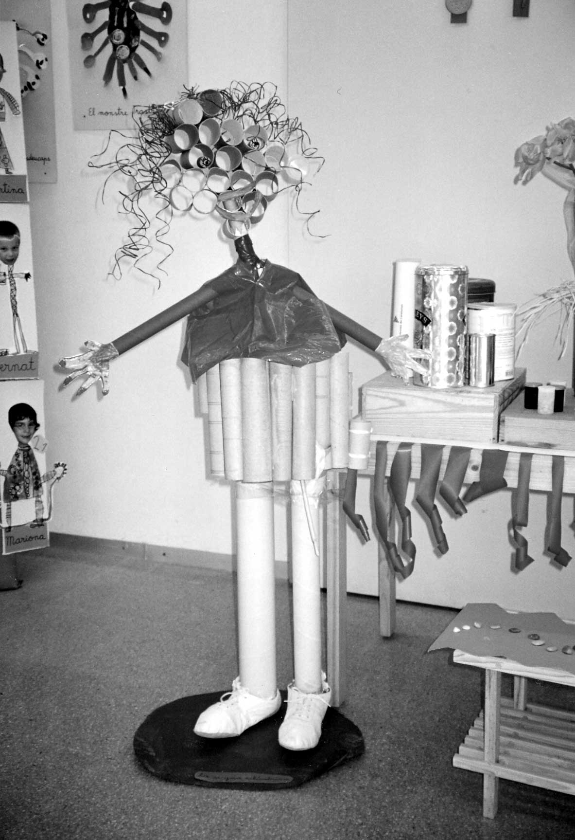 No us penseu, construir una senyora no és cosa fàcil. Amb cola forta van haver d’enganxar molts rotlles de tota mena per donar forma al cap, al cos, a les cames. Van haver d’embolicar moltes tires de filferroplastificat per poder donar forma cilíndrica i rinxolada als cabells. No podien oblidar-se dels ulls, que van enllestir amb taps de suro també cilíndrics. Les orelles, les van solucionar amb potets de plàstic. Ja la teníem llesta, li vam retallar un vestit, li vam calçar unes sabates. Era tan maca, tan alta, tan impressionant! Només faltava que parlés, que ens digués alguna cosa. La vam exposar al passadís de l’escola, juntament amb altres treballs i va suposar un esdeveniment molt gratificant tant per als més petits com per als més grans. Per exemple, les famílies es van sorprendre de la quantitat d’idees que s’havien generat i les realitzacions que s’havien fet a partir dels taps, pots, rotlles, cordills..., que havien ajudat els seus fills a buscar a fi de donar sortida a la seva demanda. I els infants protagonistes van poder explicar tot el procés que s’havia seguit a les famílies i, també, a altres companys més petits. Aquest treball esplèndid que es va allargar en el temps va permetre unes primeres nocions intuïtives de volum, de dimensió, d’amplària, de llargària... Va suposar, també, la recerca dels materials, la intervenció de l’ajuda de les famílies, el seu permís per portar a l’escola segons quins materials, la classificació i la construcció, que va suposar organitzar-se en equips per poder construir una obra conjunta, una obra de tot el grup. Josepa Gómez, mestra. Extret de: Senyora Cilíndrica, Barcelona: Associació de Mestres Rosa Sensat, 2005 (col·lecció Temes d’Infància, 52).