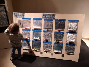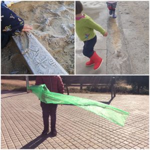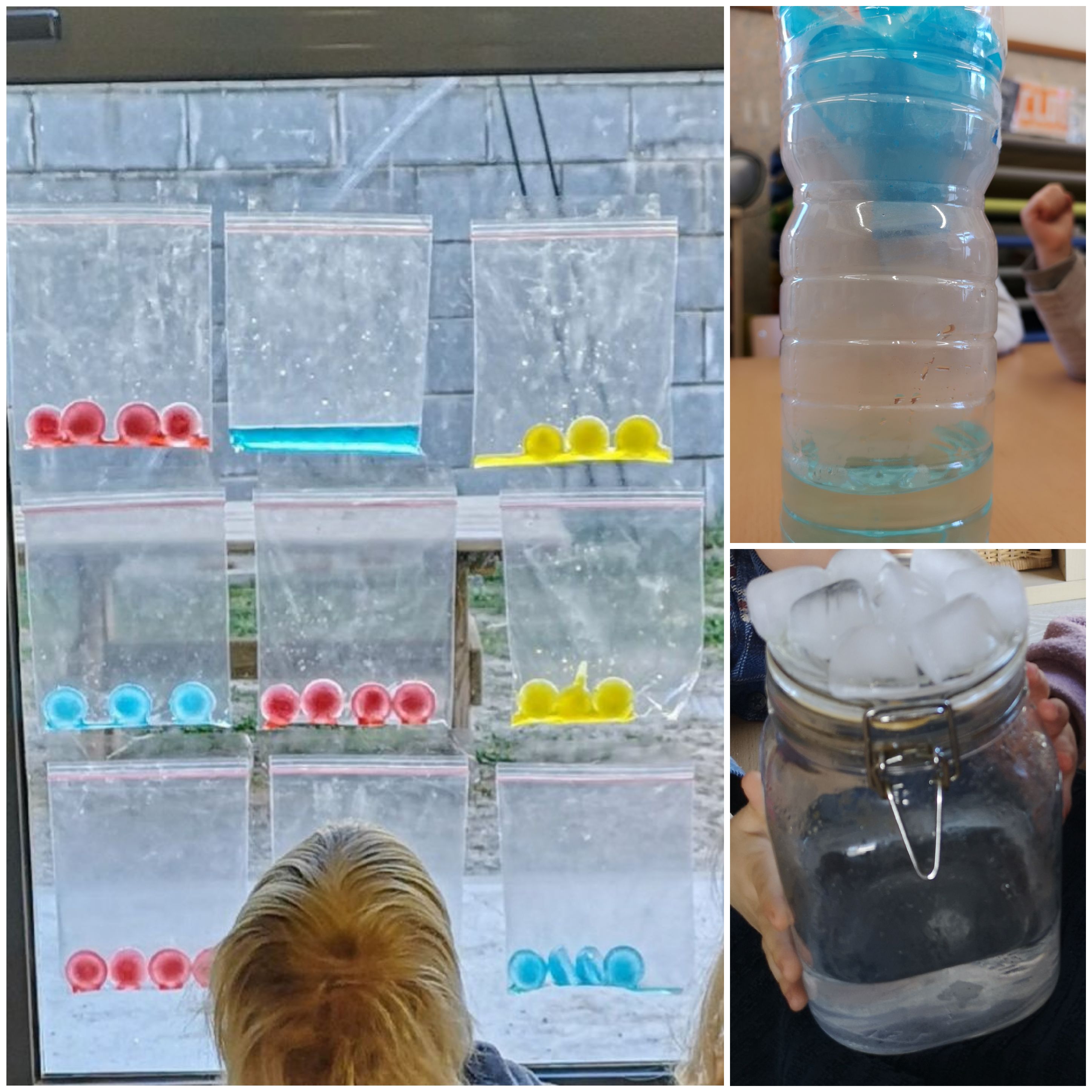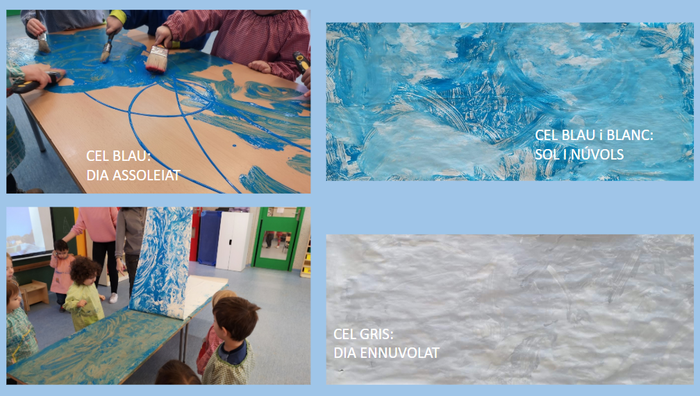 Les mestres documenten amb fotografies i les van incorporant a la classe en moments de rotllana, per tal de reviure i compartir com a grup les idees que es van adquirint en relació amb el temps. A una de les fotografies hi surt el Marc, amb un somriure i els ulls tancats. «És el Marc! Està content. I tanca els ulls.» «Sí, perquè fa caloreta», diu el Marc. «I fèiem xep xep als bassals.» «Amb les meves botes!» «I jo el paraigua», van afegint els infants mentre el Pol ensenya una fotografia. També es realitzen uns murals amb els colors dels diferents cels i els infants queden absorts amb el traç que va deixant el pinzell. Paral·lelament, es porten a terme una sèrie d’experiments que ajuden a comprendre els fenòmens: fer un núvol a dins d’una ampolla i veure com plou, fer boira a dins de bosses hermètiques penjades a la finestra de la classe, fer glaçons i veure què passa.