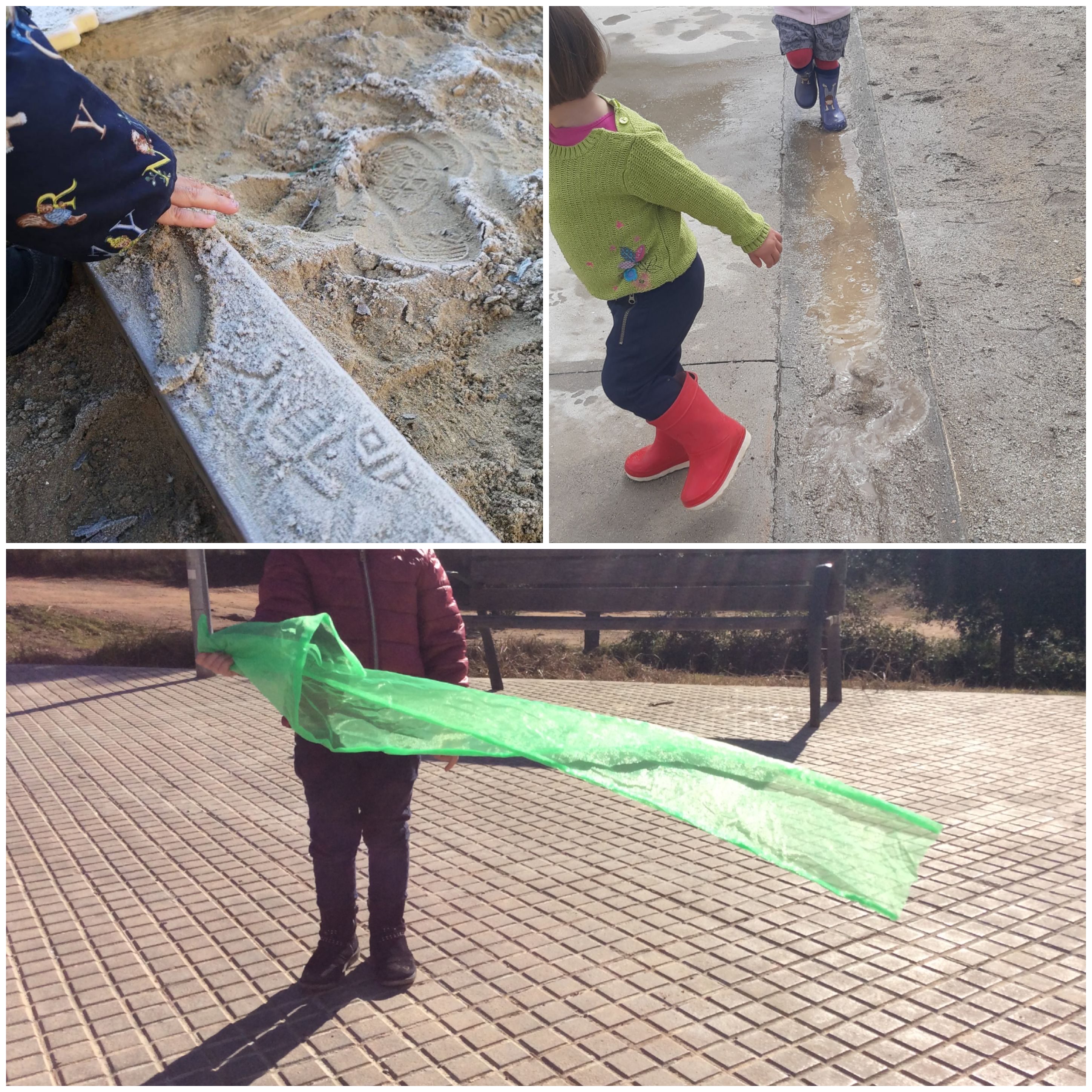 L’endemà, un infant explica a la mestra que el cel està tot blanc. La mestra invita l’infant a compartir amb el grup el que ha observat i algú altre proposa sortir a fora. Així es crea aquesta dinàmica diària on els infants perceben els diferents fenòmens meteorològics. Per tal d’enriquir aquestes sessions i ajudar els infants a establir-hi contacte, la mestra va introduint diversos elements. Per exemple, aprofitant un dia que feia molt vent, la mestra convida que cada infant agafi una roba. En sortir a fora, es posen tots a córrer amb la roba a la mà. El Pol es queda quiet mirant com s’enlaira la seva roba. La Martina, que té els cabells més llargs, fa una descoberta i diu rient: «Mira». La resta d’infants se li apropen i es queden mirant com la seva cabellera s’enlaira. Ara tots volen veure si els seus cabells s’enlairen i es miren els uns als altres esperant qualsevol moviment.