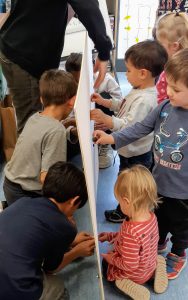 Per finalitzar el projecte, les mestres, amb la col·laboració de la classe dels grans de l’escola, van idear el plafó sensorial Els cels de Rellinars. Els grans van fer un circuit elèctric (aquest grup estava realitzant un projecte sobre l’electricitat) que va permetre sentir els sons que els infants havien gravat: la pluja, el vent, els ocells, etc. Quan el plafó va estar enllestit, va ser exposat a l’entrada de l’escola. El grup va anar grup per grup convidant tothom a apropar-s’hi i experimentar. A les primeres classes, tots estaven una mica avergonyits i les mestres els van ajudar més, després ja no. La Carla entra al capdavant de tots, després de trucar a la porta. L’Èric, de 18 mesos, entra als braços de la mestra i, amb un somriure, li dona els fulls explicatius a la mestra de la classe. Tots resten expectants al que diu la Carla: «Hola Carla! Com estàs?», li pregunta la mestra de la classe. «Bé, tenim un plafó que pitges els botons i fa sorolls. Voleu venir? És a l’entrada de l’escola.» D’aquesta manera es creen sinergies que es transformen en un coneixement compartit, fet cohesionador de tota la comunitat educativa.