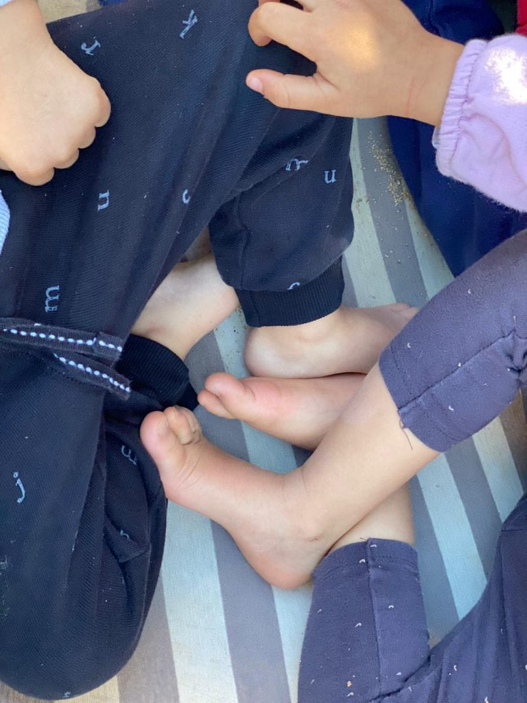 Tot i que no sempre és fàcil arribar a un consens, atès que cada membre de l’equip té les seves raons, es va arribar a la conclusió que els peus haurien d’estar en llibertat i en contacte amb el món i amb les sensacions que n’arriben, i que l’infant hauria de poder estar a dins descalç, amb mitjons o amb sabates. Ell és qui està descobrint i coneixent el seu cos, la temperatura que sent i les seves necessitats.