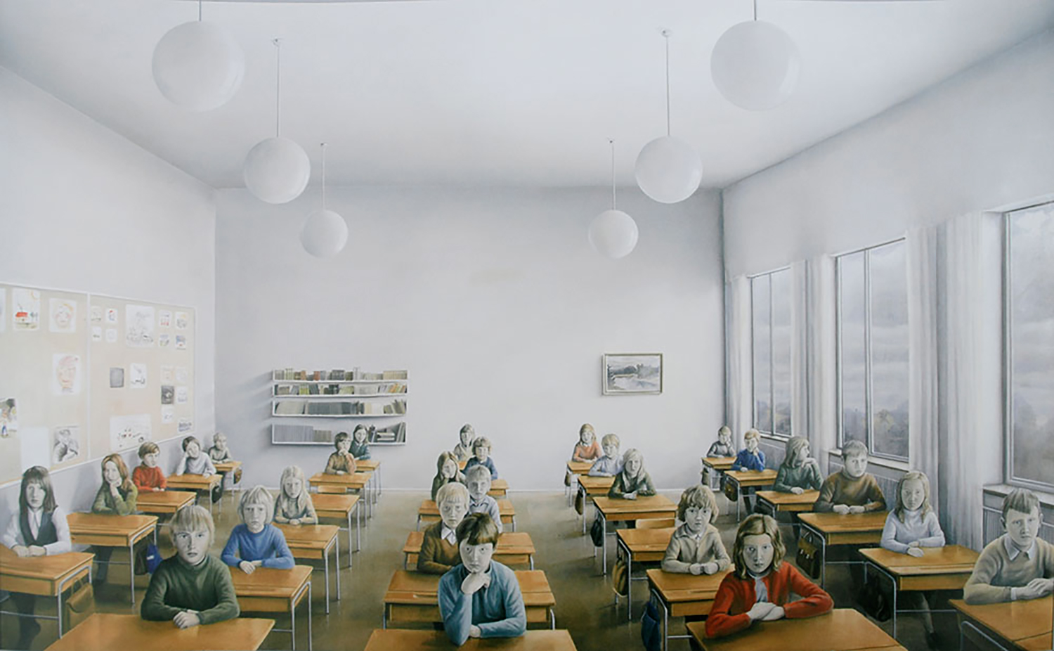 O pintor sueco Peter Tillberg retrata com seu pincel - Será lucrativo, meu amigo? - como uma sala de escola pode ser sem imaginação. Observe que Tillberg não deu pernas aos alunos. Não há ilusão de que eles podem fugir. Eles são apanhados pela ideia de que esta é a melhor e a única maneira de adquirir conhecimento.
