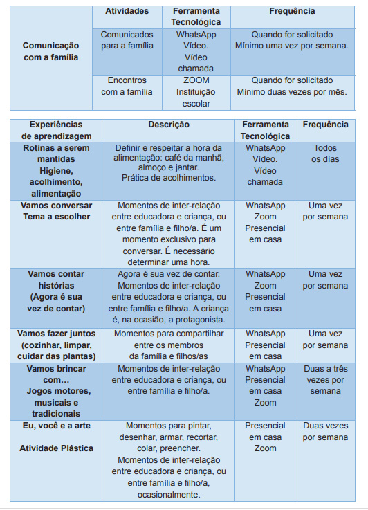 De um dia para o outro, o mundo mudou. 2020 trouxe consigo um inimigo invisível que modificou completamente todas as nossas atividades. Sair era perigoso e nossa casa tornou-se um espaço seguro no qual todas as atividades diárias seriam concentradas. No Equador, a emergência sanitária provocada pela pandemia COVID-19 gerou, no mês de março, o cancelamento na primeira instância das atividades escolares e posteriormente a paralisação da maioria das atividades econômicas. Foi assim que os centros educacionais foram obrigados a fechar suas portas e modificar sua forma de ensinar, incorporando ferramentas tecnológicas e transformando os pais e mães em participantes ativos do processo educativo. Começou, então, o chamado “novo normal” na educação. Imersos nessa realidade, os Centros Infantis do município de Rumiñahui, cantão localizado no sudeste da província de Pichincha, começaram a reorganizar seu processo educacional. Sem um maior conhecimento do que significa implantar sistemas de teleducação ou educação virtual, os 33 educadores, 9 coordenadores e 5 assistentes pedagógicos dos 9 centros infantis pertencentes a este cantão foram motivados a gerar propostas de caráter didático e continuar atendendo aos mais de 650 meninos e meninas, com idades entre 3 a 5 anos. Assumir esse desafio exigiu gerar mudanças, tanto no pensamento quanto nas ações docentes. Repensar a educação, gerando propostas e formas de ensino que garantam os processos para o desenvolvimento integral de nossas crianças, tornou-se uma prioridade para a comunidade educativa de Rumiñahui. Em primeiro lugar, era importante levar em conta os dados estatísticos que revelam os aspectos socioeconômicos das famílias das crianças, pois davam pistas sobre como organizar as atividades a partir do acesso que cada família tinha à tecnologia. À escassa conectividade e ao limitado acesso aos dispositivos tecnológicos que tanto a família quanto os educadores (as) apresentavam, somava-se a falta de conhecimento para a implantação da educação virtual e do teletrabalho. Essas dificuldades tiveram que ser superadas quase que imediatamente para dar continuidade aos processos de aprendizagem e manter a comunicação direta, além de dar suporte emocional e psicológico às crianças e suas famílias. Com as dúvidas latentes na equipe de profissionais sobre a relevância de quais ferramentas tecnológicas poderiam ser aplicadas com a população infantil, foram implantados processos de formação curtos para os educadores (as) por meio de tutoriais e reuniões via zoom, com o apoio do Departamento de TIC do Município. Foi acordado usar Zoom, WhatsApp, YouTube, Canva e Inshoot para projetar, produzir e aplicar em processos educacionais e informativos. Nesses encontros, o diálogo permitiu ir além das orientações didáticas e informativas da situação atual, reconhecer que o lar não é a escola e que os pais não são professores, chegando-se a um acordo, “não transferir a sala de aula para casa “. Com essa visão comum, optou-se por configurar um plano simples com suporte técnico cujo conteúdo deveria ser informativo e educativo, apoiado na aplicação de alguns meios tecnológicos. A gestão curricular é tarefa do educador infantil, a dinâmica de sua aplicação gira de acordo com a criança e seu contexto, de forma sequencial e sistemática, atenta ao cumprimento dos objetivos curriculares pertinentes. Como afirma o Currículo da Educação Inicial do país “todas as crianças são seres biopsicossociais, são únicas”, o que as coloca como “atores centrais do processo ensino-aprendizagem; são sujeitos da aprendizagem a partir das suas necessidades, potencialidades e interesses”. Sem descuidar desse propósito, o planejamento emergencial exigia priorizar a realidade atual da criança e de sua família, identificando os fundamentos do currículo, gerando as aprendizagens mínimas necessárias a partir dos interesses das crianças, fortalecendo sua autonomia, seu equilíbrio emocional, por meio de atividades lúdicas mediadas pela tecnologia. Aqui, nossa proposta executada com as crianças, e a participação da família e educadores. Dois blocos de conteúdo foram estruturados. 1. Comunicação e apoio a pais e filhos: a finalidade da sua implementação é informativa, educativa na busca do fortalecimento e sustentação do vínculo família-escola.