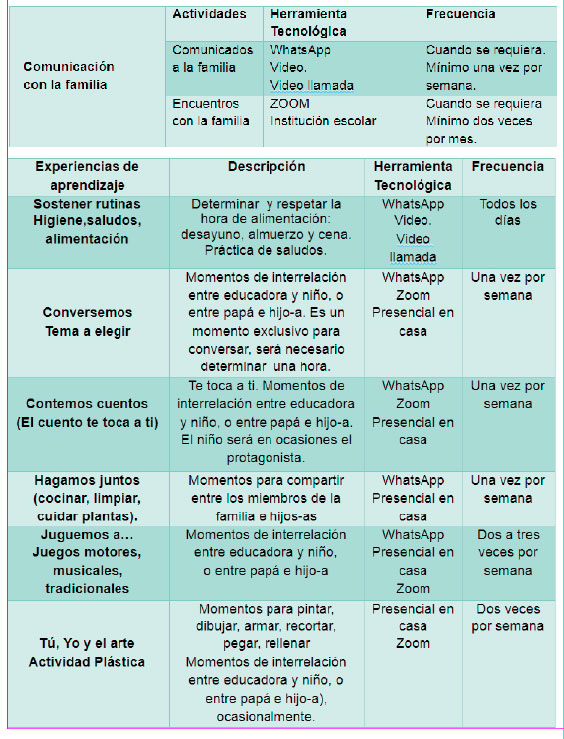 Dinámica de las actividades Así se estableció una dinámica de trabajo, entre lo virtual y lo presencial, en donde niños, niñas y familia podían seguir un cronograma en el cual se describía las actividades, los links de canciones sugeridas, los videos producidos, los cuentos en audio enviados por WhatsApp entre otros, permitiendo cumplir con el objetivo de llegar a nuestros niños, niñas, y terminar junto a ellos un año lectivo de forma diferente. Un primer encuentro a través de la pantalla Mirarnos a través de la pantalla, fue una experiencia realmente emocionante, mirarse, reconocer a los amigos, saludar a la profe, saludarse entre ellos y ellas, hablar y hablar incluso haciéndole partícipe a mamá y a papá; la intervención de la profesora, expresando sus sentimientos, animando, preguntando y escuchando a los niños, para canalizar sus intereses, emociones, inquietudes propias de las circunstancias. Así empezamos a utilizar las herramientas tecnológicas, en este caso la aplicación “Zoom” que permite interactuar a través de la pantalla, posibilitando a los grupos de niños, mirarse, conversar, y aprender. Planificar es una actividad esencial en el rol de las educadoras infantiles. Este proceso permite determinar objetivos, actividades, recursos, tiempos de ejecución y actividades de evaluación, es una hoja de ruta que anticipa que hacer con el grupo de niños y niñas. Estos elementos, de acuerdo al currículo, pueden ser adaptados de manera que se asegure que el proceso de enseñanza aprendizaje sea óptimo. Esta flexibilidad ha permitido que, durante la emergencia generada por la pandemia, las educadoras puedan adaptar su planificación a las nuevas necesidades que presentan los grupos educativos. Las adaptaciones se realizaron pensando en mantener la calidad educativa a pesar de la incertidumbre que se vivía, entre los cambios realizados incluyeron uso de recursos tecnológicos, actividades interactivas y colaborativas, tiempos de ejecución diferentes, entre otros.   Conclusiones Desde lo árido que puede resultar la ejecución de actividades escolares con los más pequeños a través de la pantalla de cualquier dispositivo, es necesario resaltar el ánimo y la dedicación de las educadoras, quienes han logrado romper con las distancia físicas, sostener emocionalmente a los niños y a sus familias, continuar siendo las ideólogas de lo que ocurre en la actualidad en el aula tecnologizada, son las que sin ser artistas, cantan, bailan y contagian a sus niños y niñas animándoles a demostrar todo su potencial. El panorama sobre el retorno a los espacios escolares, no tiene fecha, por tanto consideramos pertinente implementar un proceso de capacitación sostenido y sistemático en el uso y aplicación de las Tic's. Queremos ser optimistas, frente a esta situación, queremos seguir aportando con propuestas, pero reconocemos también que la educación no debe seguir confinada a una pantalla. La otra pandemia, la economía familiar está afectada, papá o mamá, o los dos sin trabajo, educadoras y demás personal que labora en los centros infantiles han visto reducida su economía, este factor es determinante a la hora de implementar procesos de enseñanza aprendizaje; dispositivos, conectividad y uso de plataformas, son recursos que ameritan rubros económicos adicionales a los cotidianos, sin duda es un aspecto que pone en riesgo la calidad de los procesos educativos. El Plan Educativo COVID-19, que ha sido implementado desde el Ministerio de Educación es un apoyo constante para las y los maestros, así como para la familia. Este portal cuenta con guías de enseñanza aprendizaje, televisión educativa, programas de radio. Referencias Bibliográficas https://educarecuador.gob.ec/category/noticias/noticias-destacadas/ https://educacion.gob.ec/plan-educativo-covid-19-se-presento-el-16-de-marzo/ https://www.educacionbilingue.gob.ec/ministra-de-educacion-habla-sobre-el-avance-del-plan-educativo-covid-19/ https://recursos2.educacion.gob.ec/encasa-inicial/ https://educarecuador.gob.ec/ https://recursos2.educacion.gob.ec/encasa-inicial/ Dr. Miguel Palacios Varas Director de educación, cultura, deporte y recreación del GADMUR Mgs. Ana Tacuri Velasco Revista Infancia Latinoamericana - Ecuador