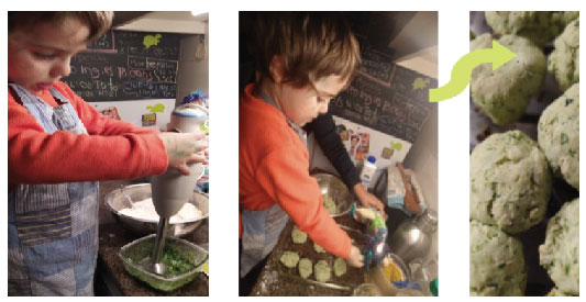 Tomás (3 años), cocina escones Hulk usando espinacas para teñir la masa