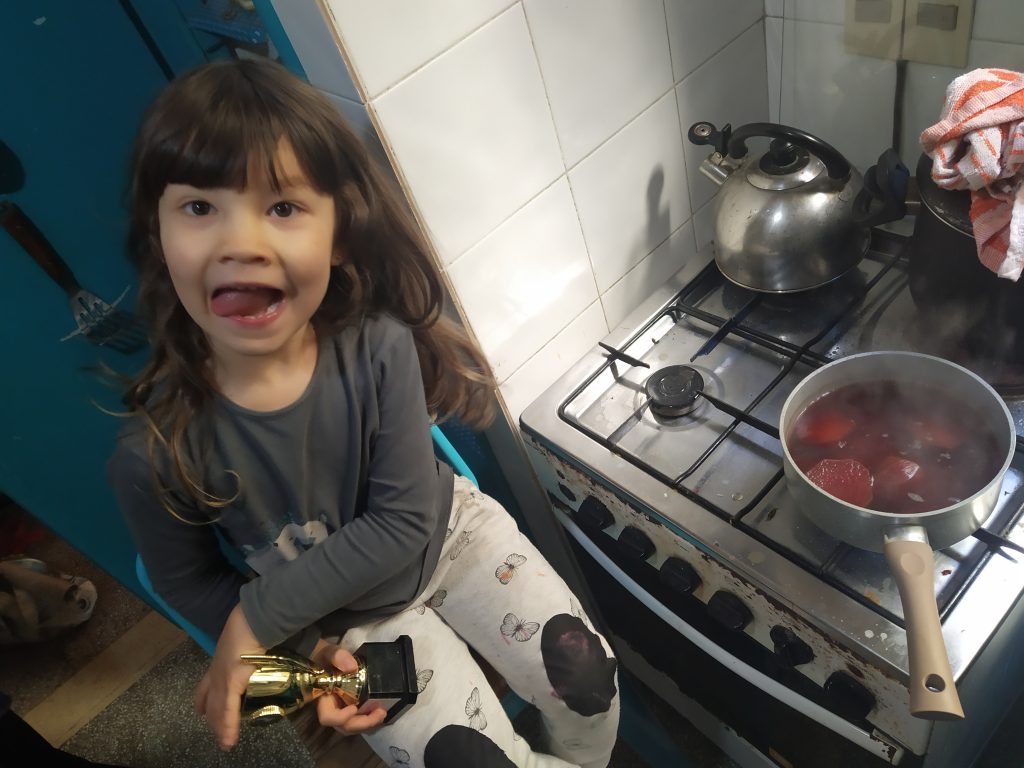 Mi cocina, se transforma entonces, en el escenario de la comunicación y de la educación virtual. A través de videos, comparto con el grupo esa transformación de una cocina que a veces es biblioteca, con distintos formatos de recetarios, con cuentos que proponen experimentos o que narran historias inverosímiles y humorísticas. Y que otras veces, con un “abra cadabra”, se transformará en un laboratorio para experimentar o en un taller para pintar. En este diálogo virtual, la cocina de los niños y niñas también se transforma.