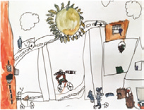 Unas propuestas que se suceden de manera natural y habitual año tras año son las relacionadas con el entorno, la ciudad y el barrio. Construir escuela junto con lo que y quienes nos rodean es uno de los pilares en los que se fundamenta el proyecto. Pero que suceda de manera habitual no significa que siempre se haga de la misma forma, ni que los niños y niñas de un mismo grupo, en un mismo año, lo vivan ni lo representen de la misma manera. Cada criatura vive la experiencia y ve su barrio desde su individualidad, con el filtro de sus experiencias previas e intereses y como tal lo expresan.