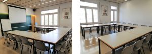 • Segons les teves necessitats, podem equipar l’espai amb el mobiliari següent: cadires (amb braç i sense), taules, pissarra portàtil de paper i prestatgeria.