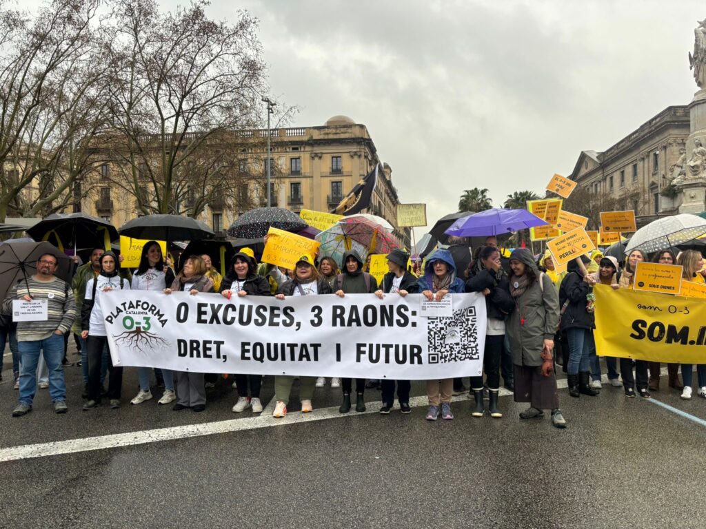 Aquest dissabte 14 de març, sota una pluja persistent, però amb una mobilització molt participada, al voltant de 2.000 docents i professionals d’escoles bressol ens vam manifestar a Barcelona per reclamar un tracte digne i recursos suficients per a l’etapa educativa de 0 a 3 anys. La protesta, organitzada per la Plataforma 0‑3, va recórrer la ciutat amb consignes com “Som educació, no som guarderia” i “Menys ràtio, més qualitat”.