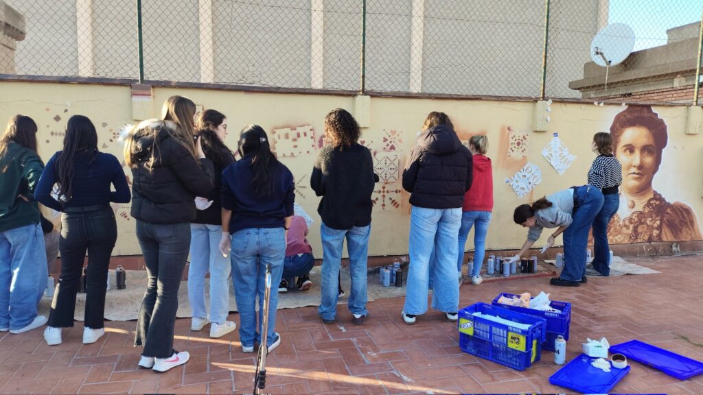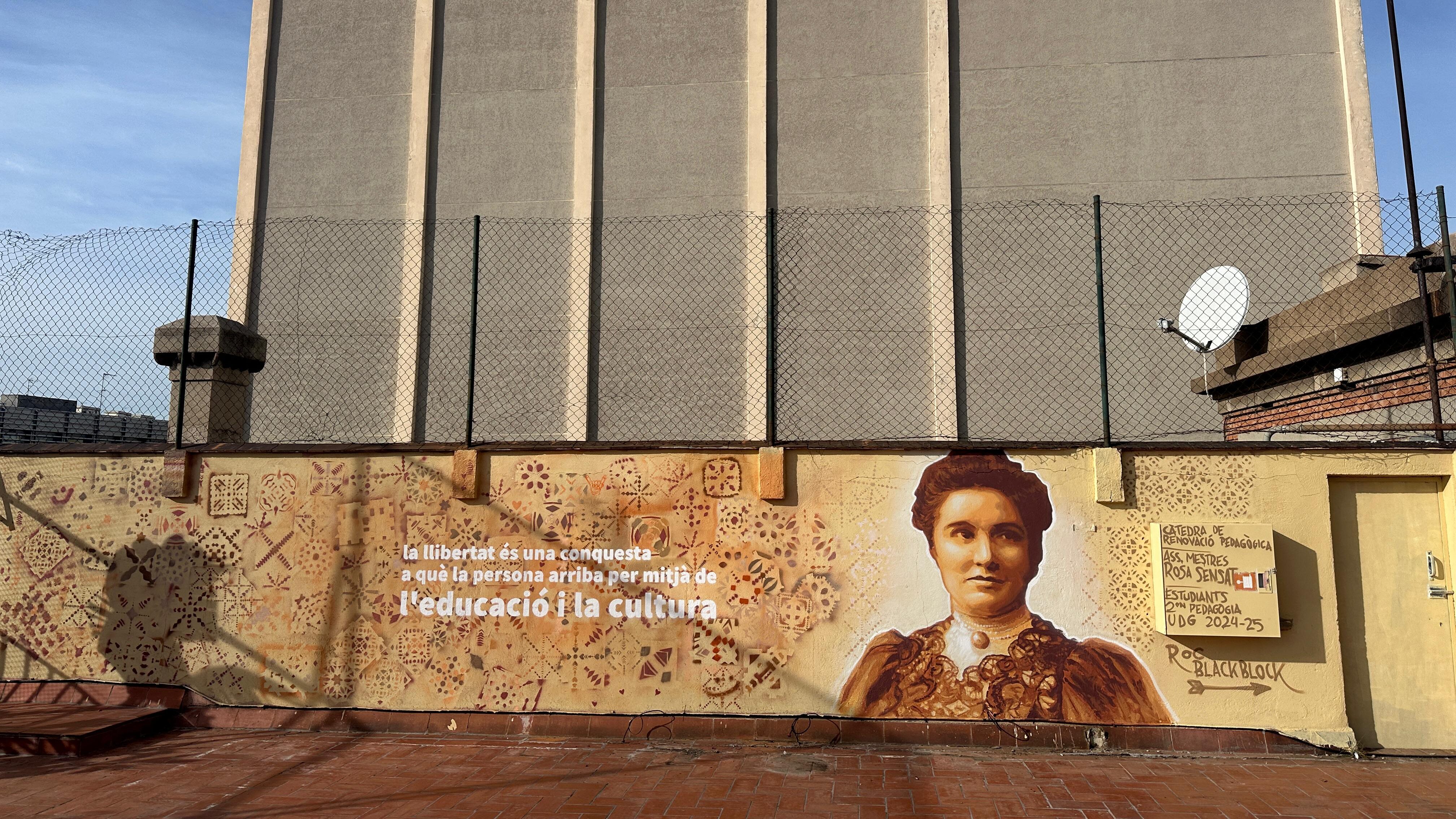 Sota la direcció de l’artista Roc Blackbloc, de manera col·laborativa, s’ha pintat un mural amb la imatge de la mestra Rosa Sensat i una frase seva: