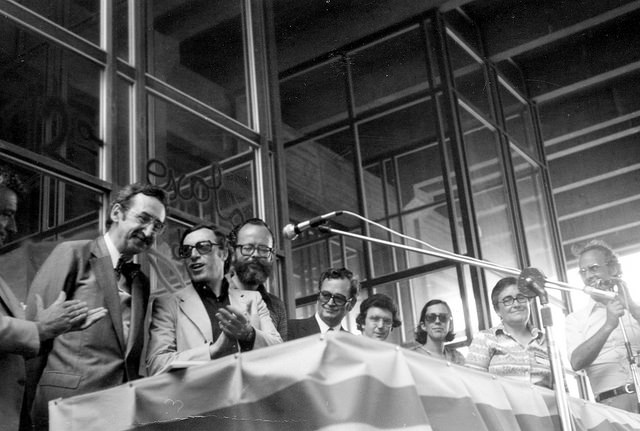 Escola d’Estiu de 1977, any d’eleccions generals. Acte amb Josep Laporte, Jordi Solé Tura, Lluís M. Xirinacs, Joan Reventós, Jaume Sobrequés, Eulàlia Vintró, Marta Mata, Ramon Moragas / ARXIU ROSA SENSAT
