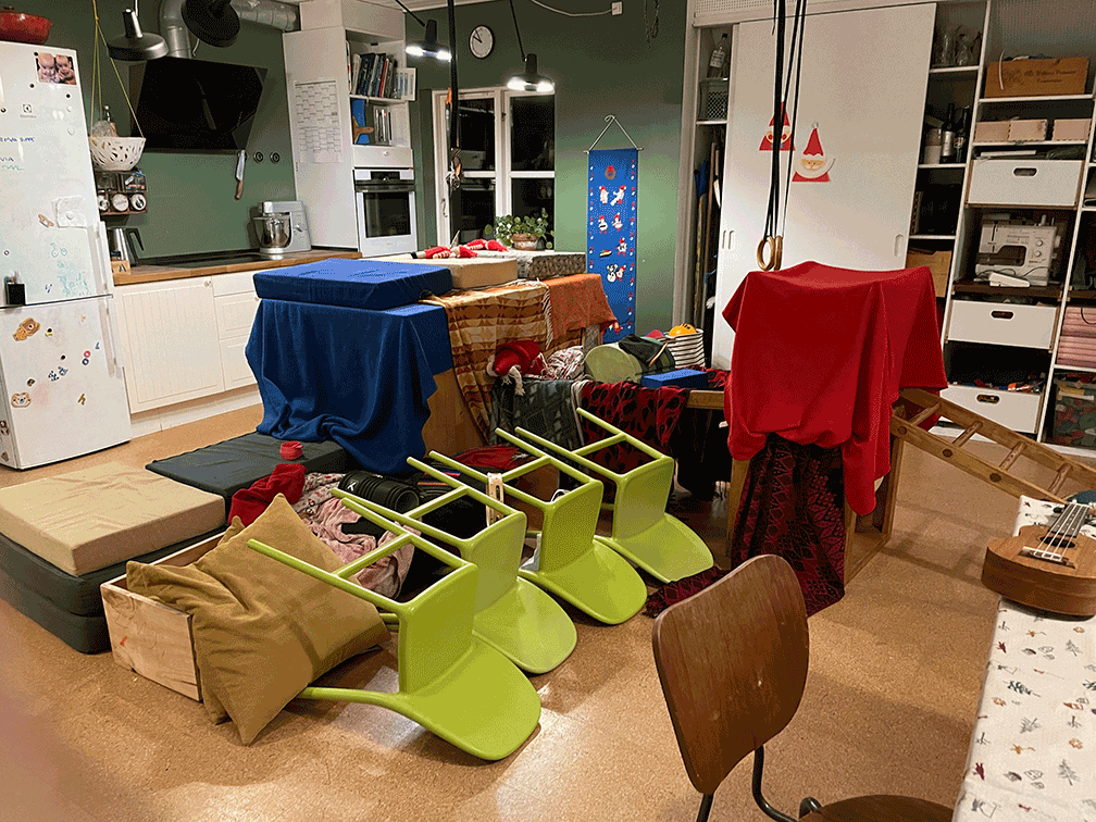 Estic impacient per sentir com aquest enfocament afecta la vida quotidiana en referència a les possibilitats digitals. Va resultar que algunes de les respostes eren sorprenentment òbvies. Quan quatre criatures de gairebé la mateixa edat es troben en la mateixa habitació, si hi ha la possibilitat, juguen. Sovint és més divertit que seure amb una pantalla. En aquesta família, a la sala d’estar hi ha espai per jugar i moure’s.