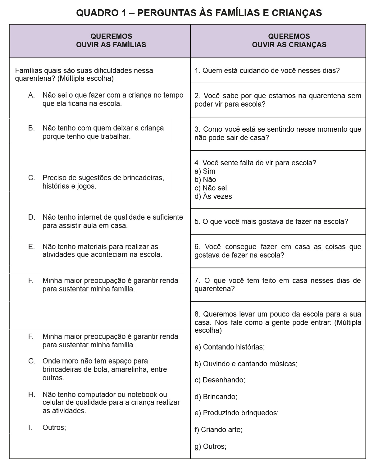 Dessa forma, antes de pensar em alternativas pedagógicas, decidimos escutar e acolher as crianças e as famílias. Construímos dois questionários, um para as crianças e outro para as famílias, para que escrevessem as suas dificuldades, mas também formas de realizar juntas e juntos o ensino remoto. Postamos os dois questionários na página da rede social da EMEI Jardim Monte Belo, no dia 17 de abril de 2020. De 420 crianças e famílias, recebemos 50 questionários respondidos pelas crianças e 70 pelas famílias.