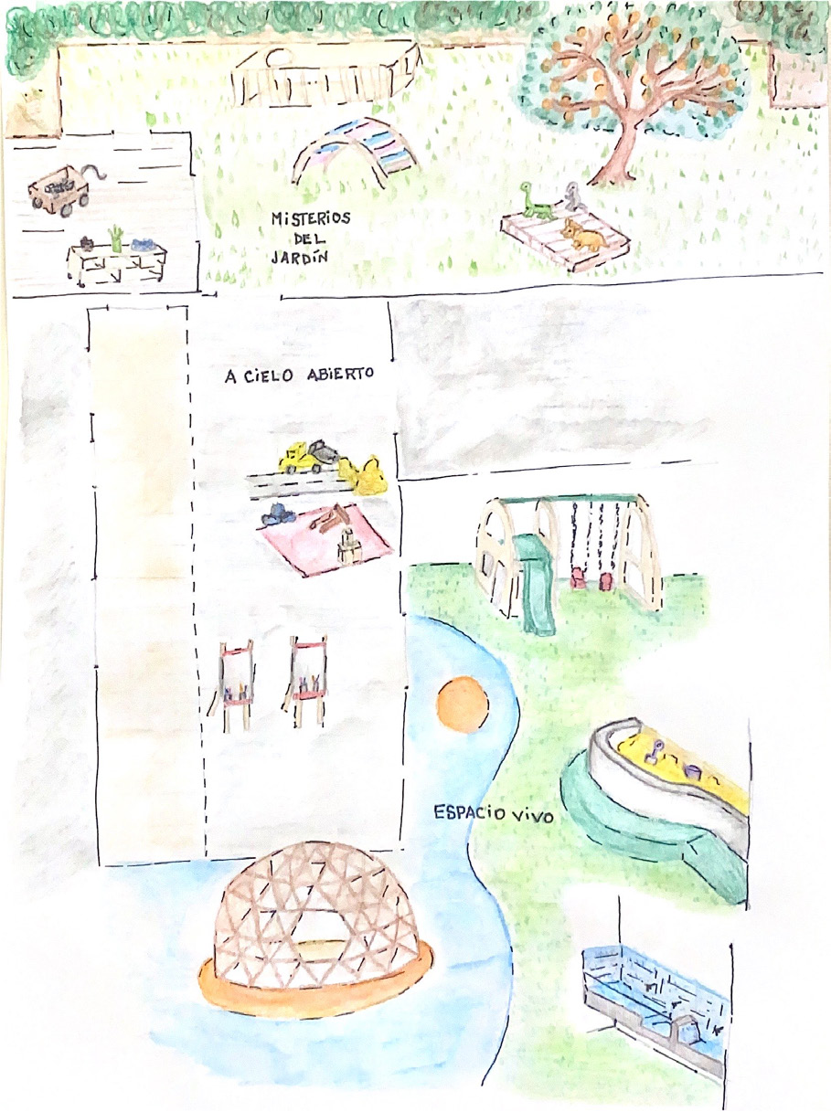 Por fim, ocorreu a transformação do espaço do pátio. Várias instâncias de troca foram realizadas onde as visões foram compartilhadas em torno das necessidades, objetivos e intenções desse espaço de jogo. Para o projeto desta área, foi convocada uma equipe de arquitetos especializados na criação de espaços para a primeira infância e realizados trabalhos de forma articulada na sua realização. Tornou-se o “Espaço vivo” onde diferentes linguagens se comungam para dar lugar ao movimento, à sensorialidade da areia e da água, ao abrigo, ao esconderijo.