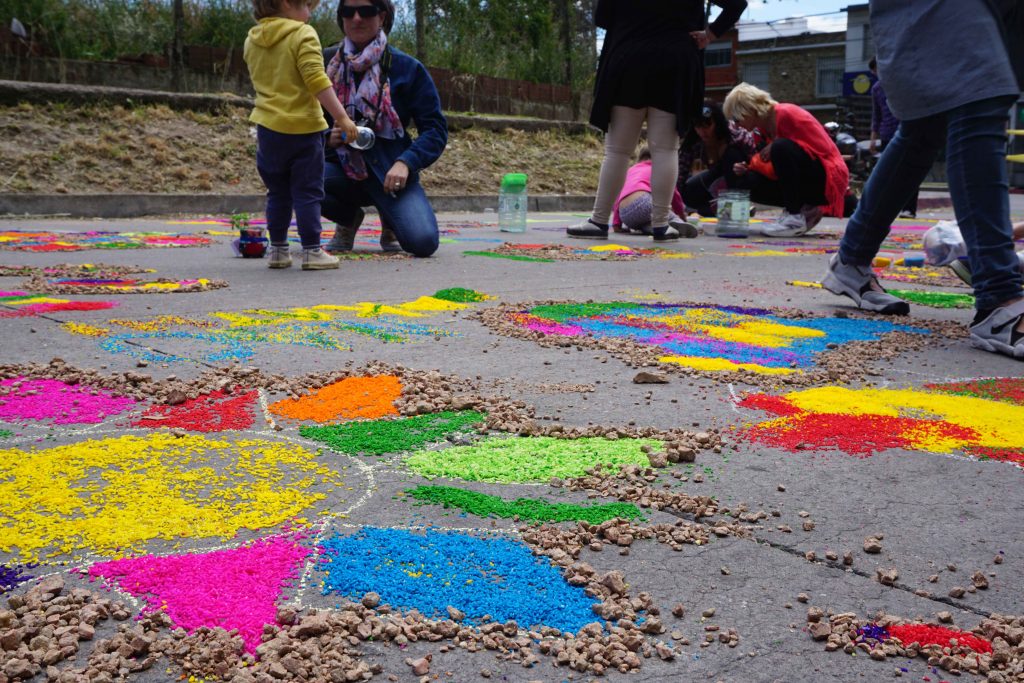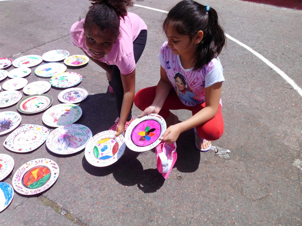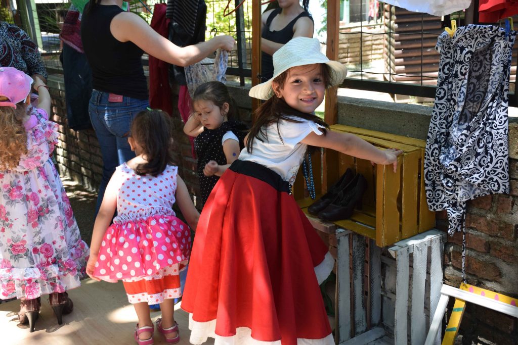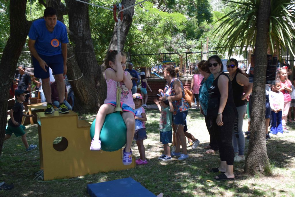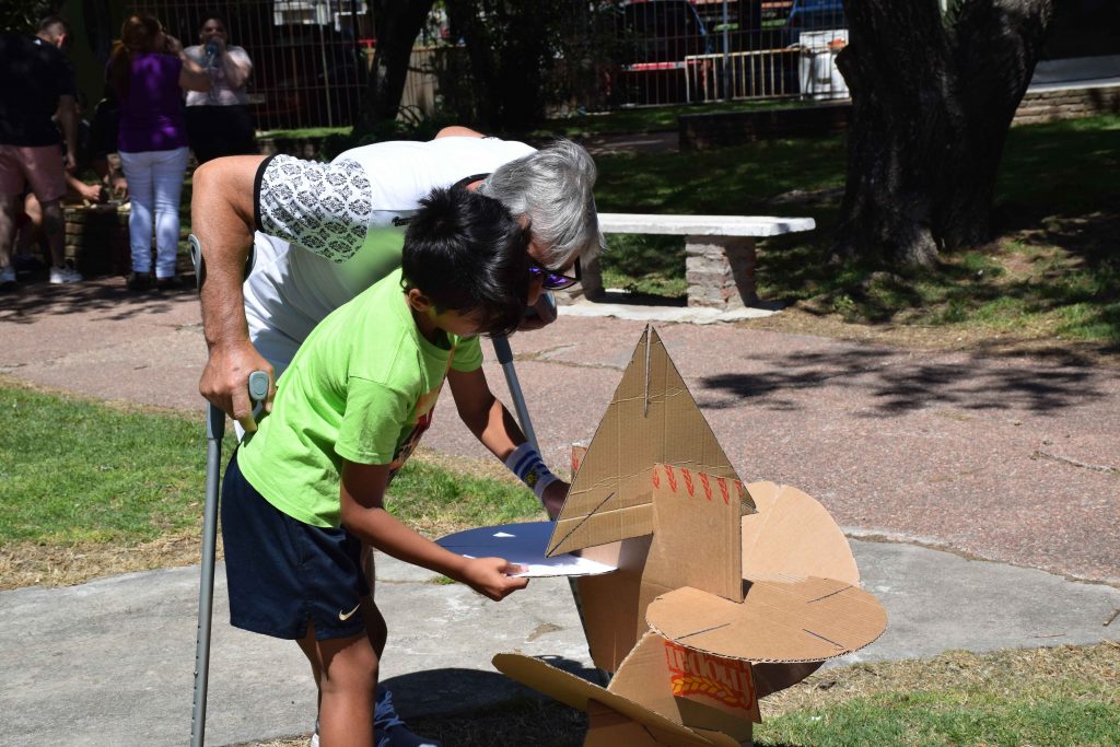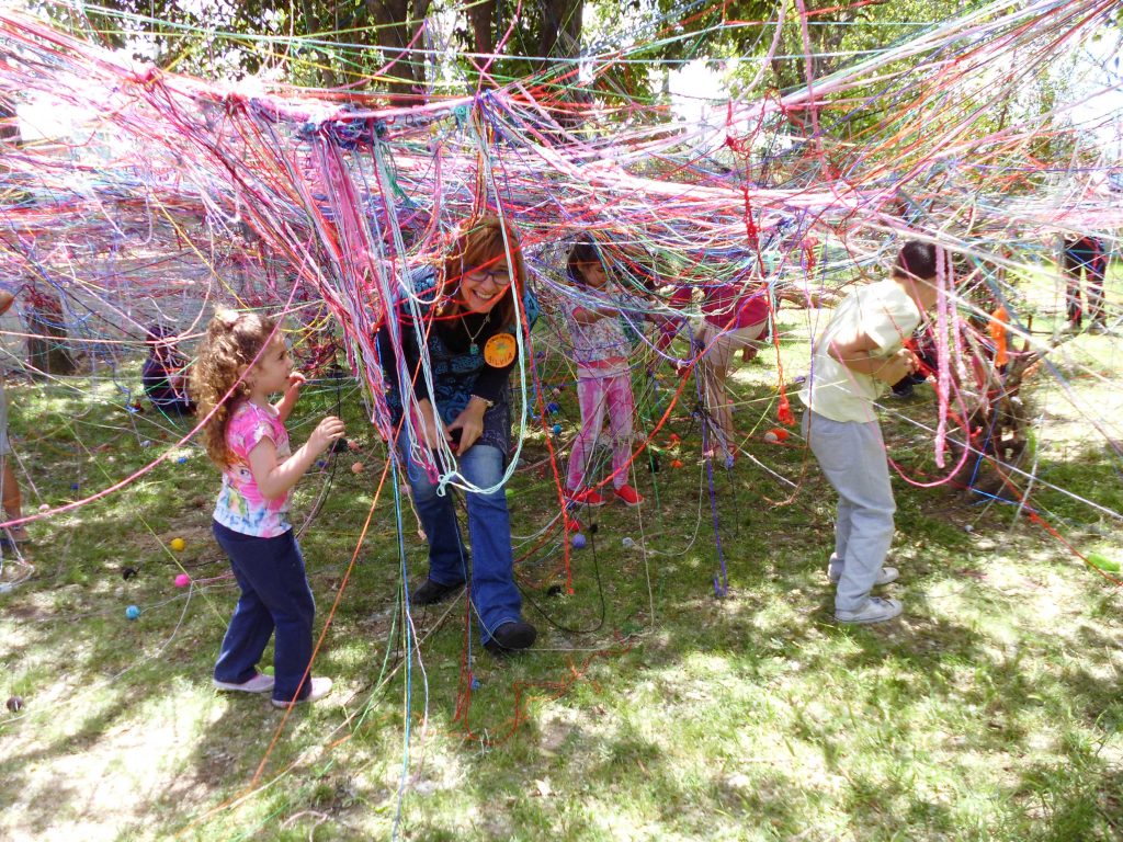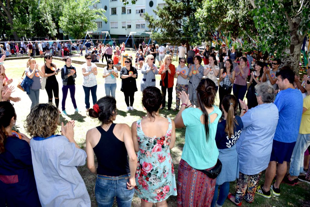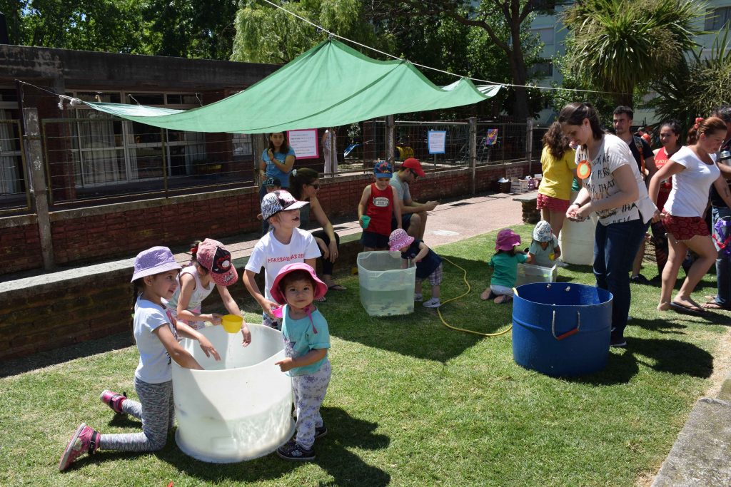 Miradas que hablan, gestos que reflejan el alma Manos que hacen, exploran y crean Sonidos y aromas que esperan ser descubiertos Seres que se encuentran para pensar sentir junto a otros… que tejen una comunidad Un espacio que se transforma al ritmo de las risas, el asombro y la comunión de las infinitas e excepcionales formas de ser y estar que los niños nos regalan… Hacer juntos, sentir juntos, ser juntos… Bajo un cielo, con nuestro corazón al descubierto, dispuestos a celebrar el maravilloso desafío de seguir inventando lenguajes para expresarnos y encontrarnos”. ¿Quiénes somos? Nuestro Jardín de Infantes se encuentra ubicado en Malvín Norte, un extenso barrio de la ciudad de Montevideo – Uruguay. Es un centro público, de administración estatal que funciona en la modalidad de doble turno - matutino y vespertino - con un total de 210 niños y niñas de 3, 4 y 5 años, nueve docentes incluida la maestra directora, una asistente técnica y ocho auxiliares. El edificio es amplio, funcional, adecuado a las necesidades de un jardín, fue construido con ese fin. Se encuentra inserto en una zona de muchos complejos habitacionales compuestos por grandes torres de apartamentos, pequeños parques, placitas y comercios de diversos rubros. Nuestra propuesta En este artículo relatamos una experiencia denominada “A Cielo Abierto”, es un proyecto de trabajo institucional planificado y desarrollado con todo el colectivo docente. Tiene 8 años de duración, y ha ido creciendo y enriqueciéndose con el transcurso del tiempo. Surgió del ejercicio de pensar en una escuela innovadora con una propuesta participativa, donde los niños aprenden, descubren y exploran por sí mismos, con las familias como parte involucrada en ese proceso. La experiencia fue tomando forma a partir de la reflexión y análisis de nuestras propias prácticas educativas, de las características de la infancia de hoy, de las necesidades de niños y niñas como sujetos de derechos pertenecientes a una comunidad particular. Cotidianamente observamos que niños y niñas sufren la carencia de tiempos de juego y espacios de expresión, de tiempos de escucha y de instancias compartidas con sus familias, con sus vecinos, con sus amigos. Una infancia en la que los tiempos y los ritmos son dictados por las ocupaciones laborales de los adultos referentes, por las características de la ciudad moderna, llena de tránsito, que provoca aislamiento, temores e inseguridad, que inhabilita tanto a los más pequeños como a los adultos a disfrutar de espacios comunes. A esta realidad se suman los avances tecnológicos y el consumo indiscriminado que atraviesa a toda la sociedad, donde prima la comunicación virtual y se va perdiendo la posibilidad de conectarse en forma real con el otro aún dentro de la misma familia. Nuestro Jardín de Infantes no escapa a esa realidad, los niños y niñas pasan su infancia en espacios de ladrillos: la escuela y los apartamentos. Permanentemente, a los chicos se los ve en situación de traslado, siempre camino hacia algún lado, de la casa al Jardín, del Jardín a la casa de los abuelos, nuevamente a su casa más tarde. Pareciera que no tienen derecho a usar la ciudad desde sus necesidades. Estas vivencias nos impulsan a romper esa rutina, esa imagen del día a día, de niños y niñas encerrados, no vistos, pequeños y adultos cada uno en lo suyo. ¿Qué nos proponemos? Nos propusimos crear un espacio al aire libre, en un día de fiesta, fuera del edificio escolar, abierto a todo público, en contacto con la naturaleza y los vecinos, dando oportunidad a los chicos a hacer y vivir actividades compartidas con las familias y los vecinos y a su vez ofrecer a la comunidad un espacio donde participar y compartir con los chicos. Dibujar, pintar, construir, disfrazarse, escribir, explorar, hacer música, tejer, jugar con agua, plantar, leer, recorrer laberintos, puentes y muchas más son las posibilidades que la propuesta ofrece. Las actividades se llevan a cabo en talleres simultáneos (aproximadamente 18) donde todos pueden entrar y salir cuando quieran, los pueden recorrer solos o acompañados de sus familias. Tienen un carácter integrador e inclusivo, se organizan de tal manera que todo el que concurra, sin importar la edad que tenga puede participar, disfrutar y vincularse. A Cielo Abierto habilita un espacio común en que todas las edades se encuentran para jugar y compartir. Nos permite un aprendizaje de socialización y un diálogo entre distintas generaciones” Se realiza en la vía pública lo cual permite total apertura hacia el barrio. Esta tarea supone un trabajo coordinado con las familias, los vecinos y las autoridades municipales, se corta el tránsito y se cuida del medio ambiente. Terminada la jornada todo queda impecable sin haber alterado la naturaleza. Para el evento se usa todo un parque que está en el terreno lindero al centro, la calle, veredas, muros, rejas, árboles y caminos. Para las actividades se usan materiales de desecho o bajo costo, en cantidades abundantes y suficientes para todos los que deseen participar. En la selección prima el color, el volumen y la posibilidad de manipular con seguridad y creatividad al mismo tiempo. “A Cielo Abierto” es la síntesis de una forma de trabajar con los niños durante todo el año, abordando los contenidos a enseñar desde el descubrimiento, la exploración y la escucha” La metodología de trabajo elegida por la institución habilita esta propuesta, para llevarla a cabo es necesario trabajar durante todo el año con los niños, niñas y las familias. Se planifica para un público aproximado de mil personas. A las familias se suman voluntarios para apoyar en el evento, generalmente estudiantes universitarios vinculados al Jardín o interesados en propuestas innovadoras. Las experiencias que piden los niños son: trabajar al aire libre, en espacios comunes del barrio y la ciudad, bajo el sol, sin uniformes, con permiso 