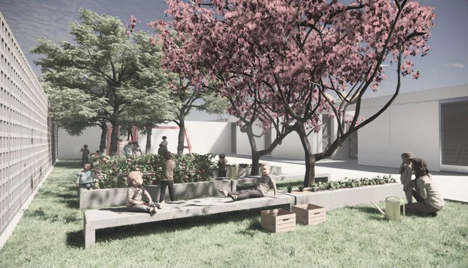 - Detalle del patio común con sector de juegos bajo la sombra y área de huerta-jardín con mesadas de trabajo. También se observa, el sector de solado impermeable para múltiples usos.Desde la mirada bioclimática de las áreas exteriores, se propone cubrir con, al menos, el 50% del total de la superficie exterior con cobertura arbórea. De ese 50%, de ser posible, un 70% de follaje caduco y un 30% de follaje perenne o semi-persistente. De esta manera, nos garantizamos verde todo el año y damos lugar a mayor asoleamiento en invierno en zonas de climas templados.