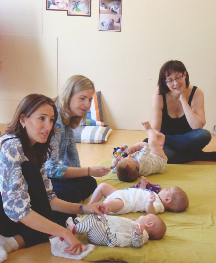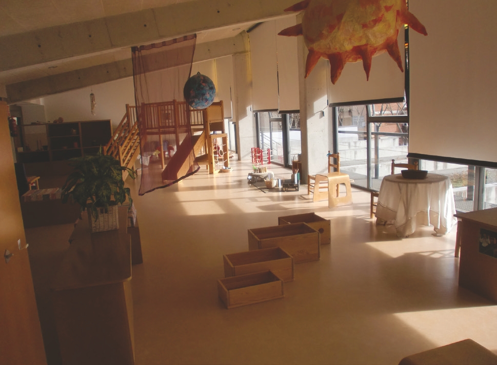 Los niños y niñas encuentran un espacio preparado con distintos elementos de juego, que van explorando y descubriendo a su ritmo. En todo momento, les acompaña la mirada y la presencia de su madre, de su padre. Al mismo tiempo, van estableciendo diferentes relaciones con el resto de niñas, niños y adultos.