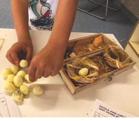 El día se despierta con este primer rato de juego libre en el aula, con propuestas variadas y atractivas para ellos y ellas que cada día cambian y que conectan con los intereses de cada uno. Seguidamente, es el momento de la asamblea, de saludarnos, contarnos y situarnos un poco, en grupo de referencia. Tras estas rutinas que nos ubican en el tiempo y el espacio, tras saber cómo se presenta el día, los rayos del sol ya iluminan y calientan todo el espacio. Puede ser que hoy sea martes, y haya Juegos matemáticos, así que Salma, junto a su grupo de cuatro compañeros, se adentrará en una de las propuestas rotativas y con material manipulativo, ideado por las maestras, para ir avanzando en la adquisición de las primeras nociones y conceptos matemáticos. Hay cuatro grupos, dos de ellos funcionando y explorando las propuestas de manera autónoma, con una supervisión y observación más distante por parte de la maestra, y otros dos con propuestas que necesitan de un acompañamiento y guiaje más cercano, y que, por ello, cuentan con una maestra que está completamente dedicada a ellos. Con esta distribución heterogénea, tanto de ritmos como de niveles de aprendizaje, se fomenta una práctica cooperativa y entre iguales, y a la vez respetuosa con el momento madurativo y evolutivo de cada uno. Las maestras hacen un registro diario e individual de las observaciones realizadas, y toda esa información es revisada y tenida en cuenta constantemente para atender a cada niño y niña en aquello que necesita, ésto es, para atender la diversidad desde la individualidad y particularidad de cada cual.