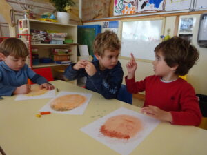 El grupo de tres años se fijó en la oreja retorcida de uno de los retratos hecho por un compañero y así decidieron observar las diferentes formas de las orejas. Mientras las representaban uno decía “Las orejas son como mi circuito de tren que también puede ser redondo u ovalado”