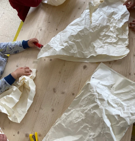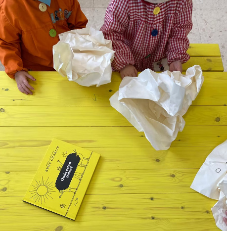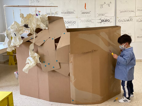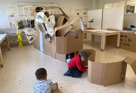 ¿a dónde vamos cuando llueve? Surge así el concepto de refugio e iniciamos el proceso de construcción del mismo. Con cartones y tornillos de plástico (juego makedo) tranformamos el aula en un lugar donde resguardarnos de la lluvia.