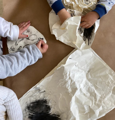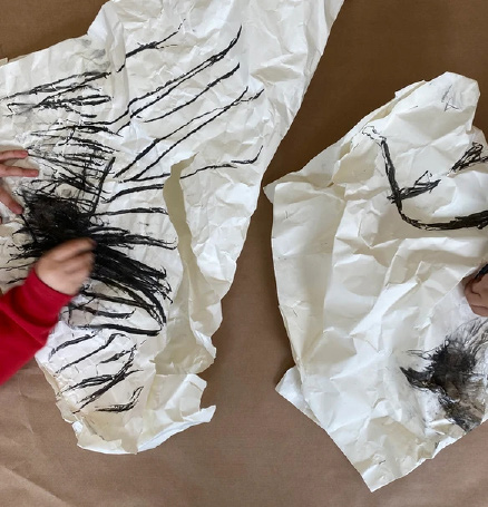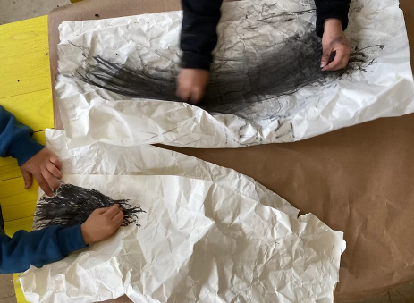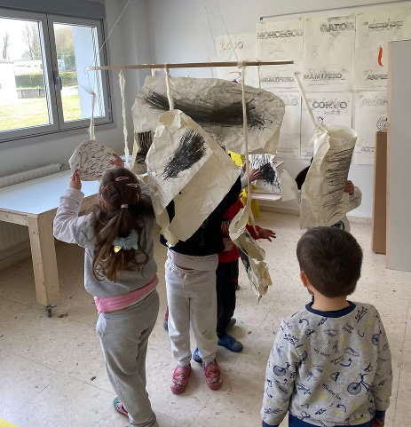 2. Una vez finalizadas las formas surge la pregunta ¿dónde está la lluvia? Incorporando un nuevo material, el carboncillo, comienza la acción de “cargar” de lluvia a las nubes A continuación las colgamos en un sencillo dispositivo y teatralizamos la llegada de la lluvia cantando o danzando.