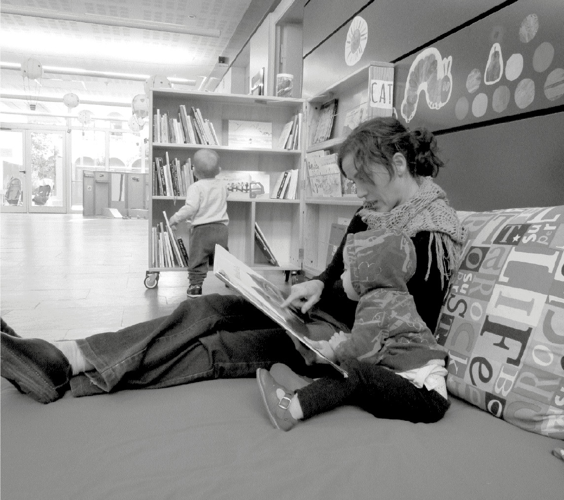 Un dels ambients que es manté al llarg del curs, inaugurat ara fa tres anys, és la biblioteca. Aquest és un espai molt particular, que disposa d’un sofà i un raconet tou amb matalàs, catifa i coixins. Aquí pares i mares poden veure i explicar, ben còmodament, els llibres il·lustrats de l’escola. Alhora, el moble on es disposen els llibres té rodes i és fàcil de moure, de manera que pugui tenir-se també a l’estança.
