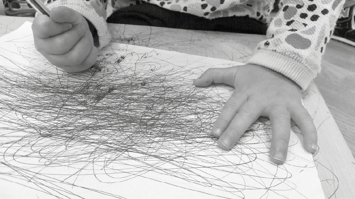 Posem a disposició dels infants fulls blancs A4 i bolígrafs Bic. El bolígraf és l’eina més adequada per tal que puguin jugar amb el traç d’aquesta manera impulsiva que necessiten, perquè és resistent i fa un traç definit. Cada infant pot dibuixar el que necessiti, amb els fulls que necessiti, als quals posem data, nom i els desem cada cop que ells ens diuen que ja han acabat.