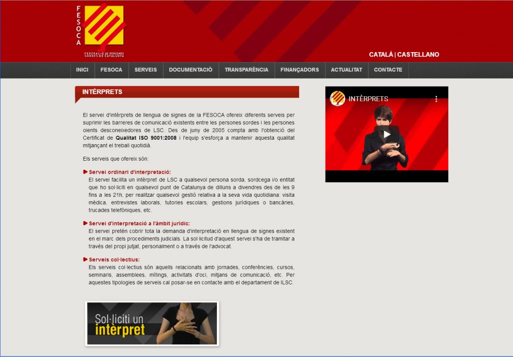El servei d’intèrprets de llengua de signes de la Federació de Persones Sordes de Catalunya (Fesoca) ofereix diversos serveis per suprimir les barreres entre persones sordes i oients que desconeguin aquesta llengua. Faciliten un intèrpret a qualsevol persona sorda que ho sol·liciti a qualsevol punt de Catalunya durant el dia, i també n’ofereixen quan se’n necessiten en procediments judicials o serveis col·lectius com cursos, mitjans de comunicació, assemblees...