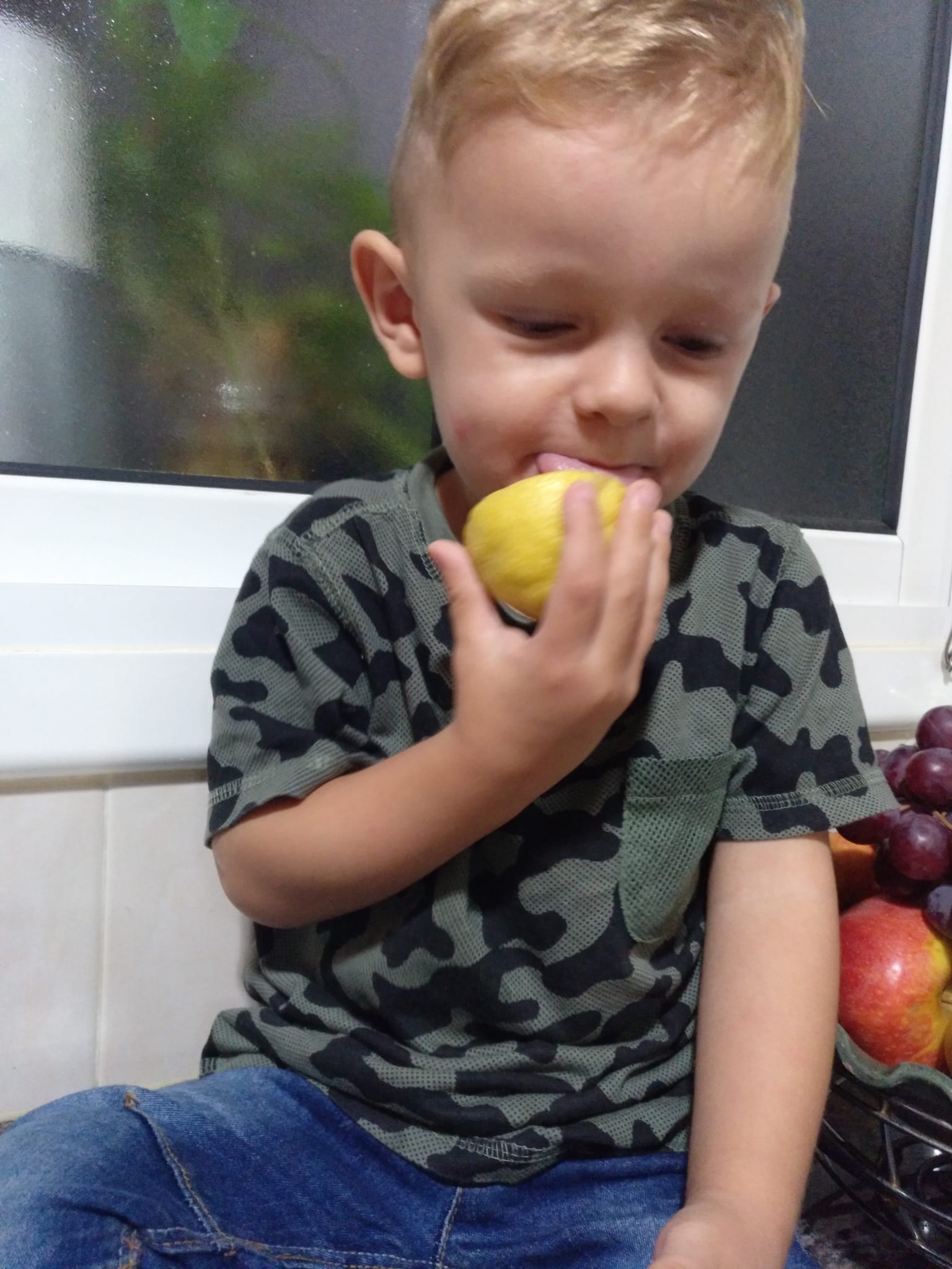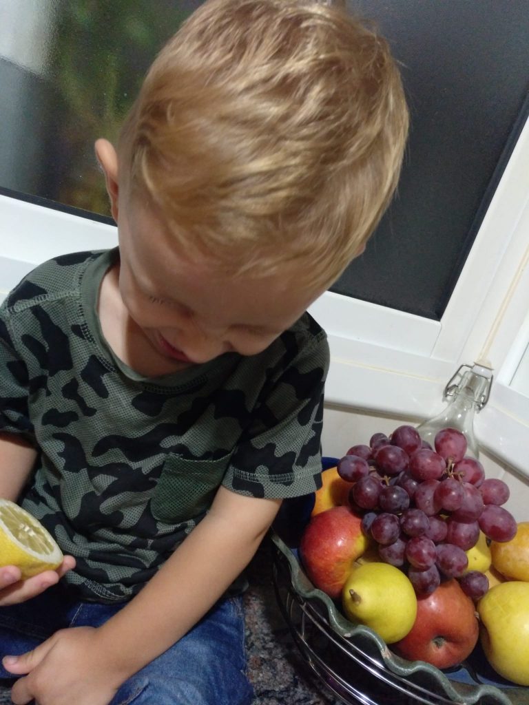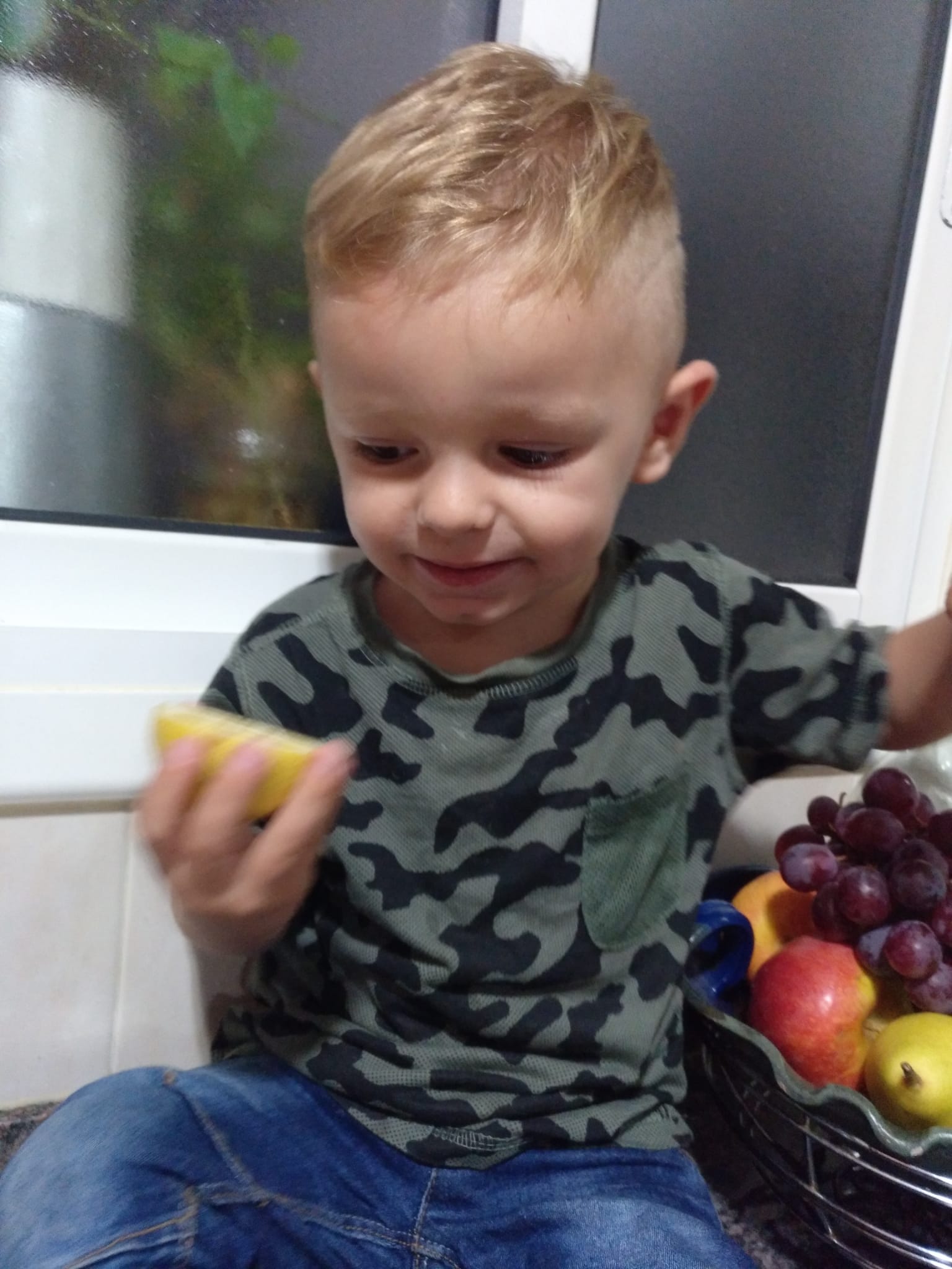 Ell es va adonar que a sobre del marbre hi havia un munt de fruites, però per poder arribar-hi va necessitar que l’àvia l’apropés i així és com va començar a explorar-les. Va llepar el raïm i la taronja. Tot seguit, va agafar un tall de llimona i el va començar a tocar, després el va voler tastar i es va endur una sorpresa: tenia un gust diferent i nou per a ell. En un primer moment, l’expressió facial d’en Cristian i les ganyotes que feia mostraven que la llimona no acabava d’agradar-li. Tot i així, va voler tornar-la a tastar i aquesta vegada la seva reacció va ser diferent, es va mostrar més content i confiat a mesura que l’anava degustant, fins i tot la va oferir a la seva àvia perquè també la tastés.